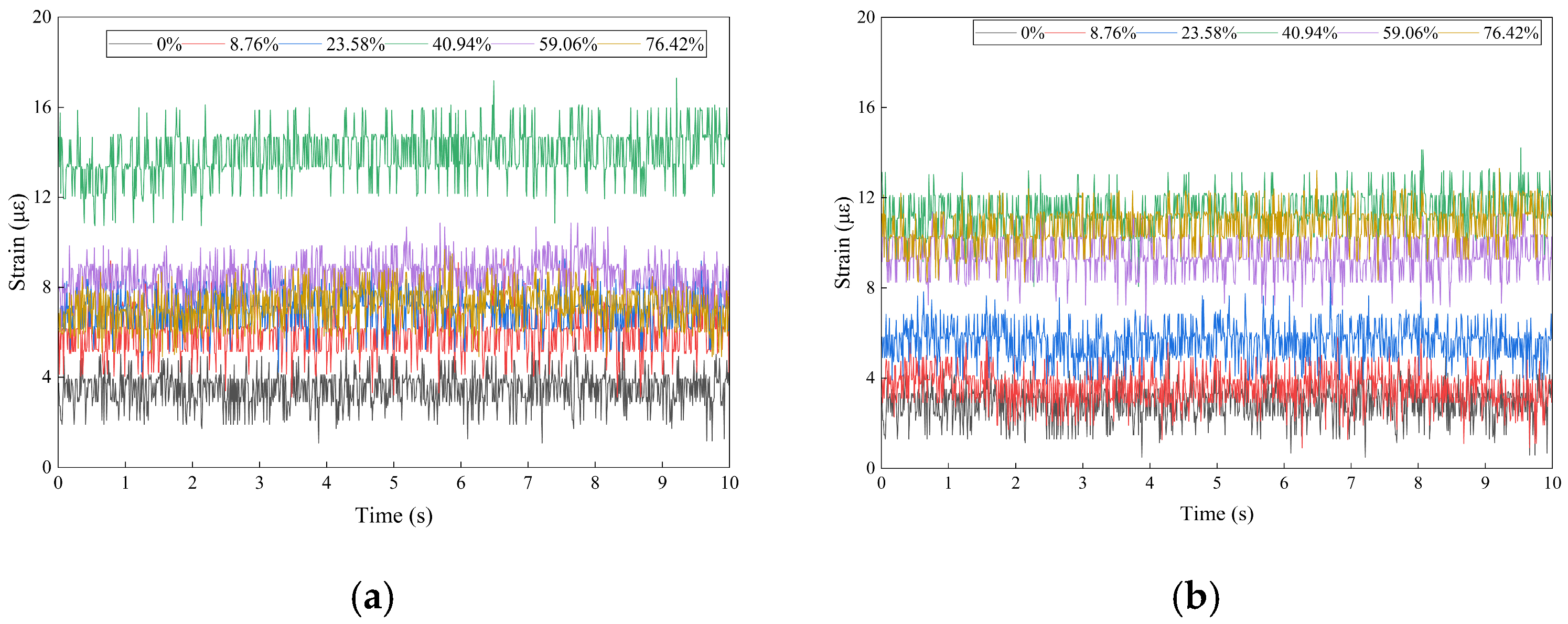 Figure 14 presents the time-domain FBG strain signals measured before and after the blockage point for varying degrees of blockage. The horizontal axis represents time (s), and the vertical axis represents axial strain (μϵ). The FBG strain signals display layered fluctuations that are primarily determined by the degree of blockage, with distinct spatial differences. The fluctuation frequencies are fully synchronized with the DAS signals, with a period of approximately 2 s, corresponding to the 1.5 Hz system fundamental frequency. Notably, FBG signals demonstrate a narrower fluctuation range, indicating strong resistance to interference. Even at a high blockage level of 76.42%, the standard deviation of FBG strain fluctuations is only 0.8 μϵ, significantly lower than 1.2 a.u. observed in DAS signals. These results confirm that FBG sensors can reliably capture local strain signals in complex vibration environments.