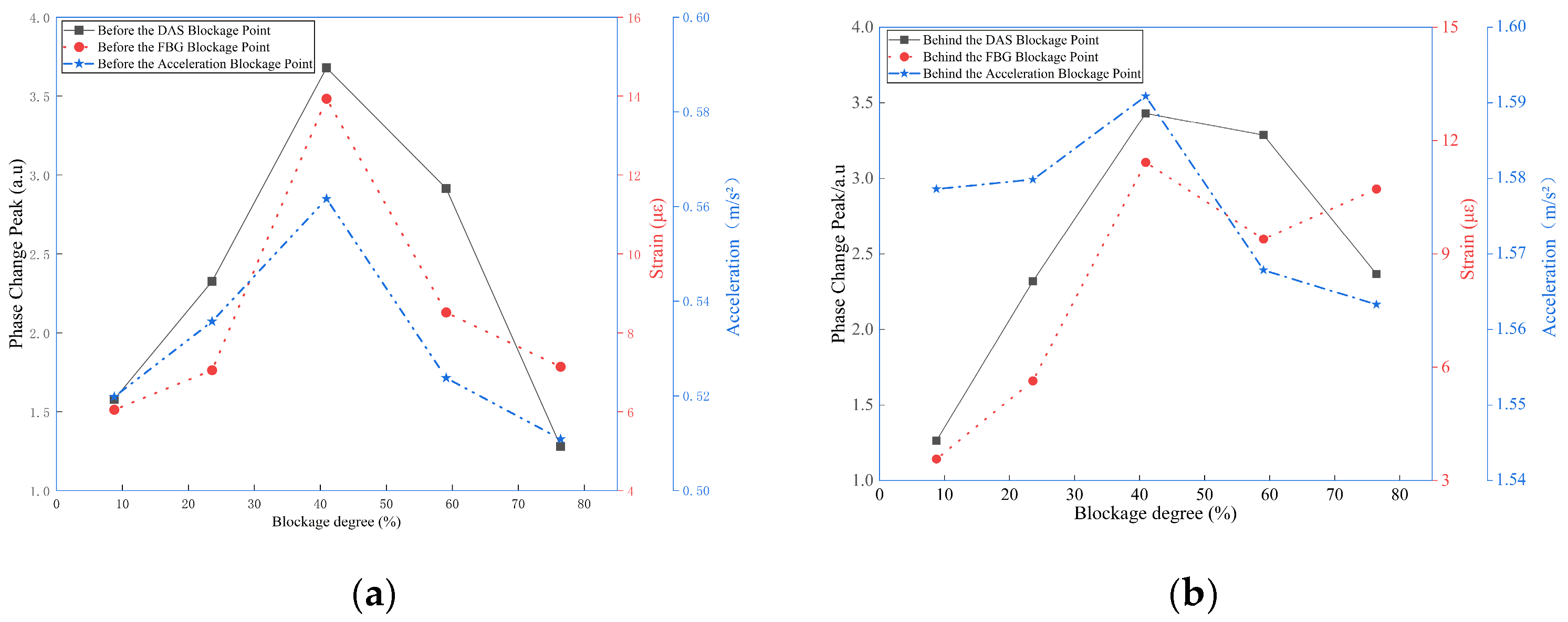 At a 40.94% moderate blockage condition, the DAS phase change rate amplitude measured in front of the blockage point is 1.7168 a.u., the FBG strain peak is 15 με, and the acceleration amplitude is 0.01227 m/s2. All sensors record higher amplitudes in front of the blockage point than behind it, which aligns with the spatial attenuation of vibration energy along the pipeline and supports effective blockage localization.