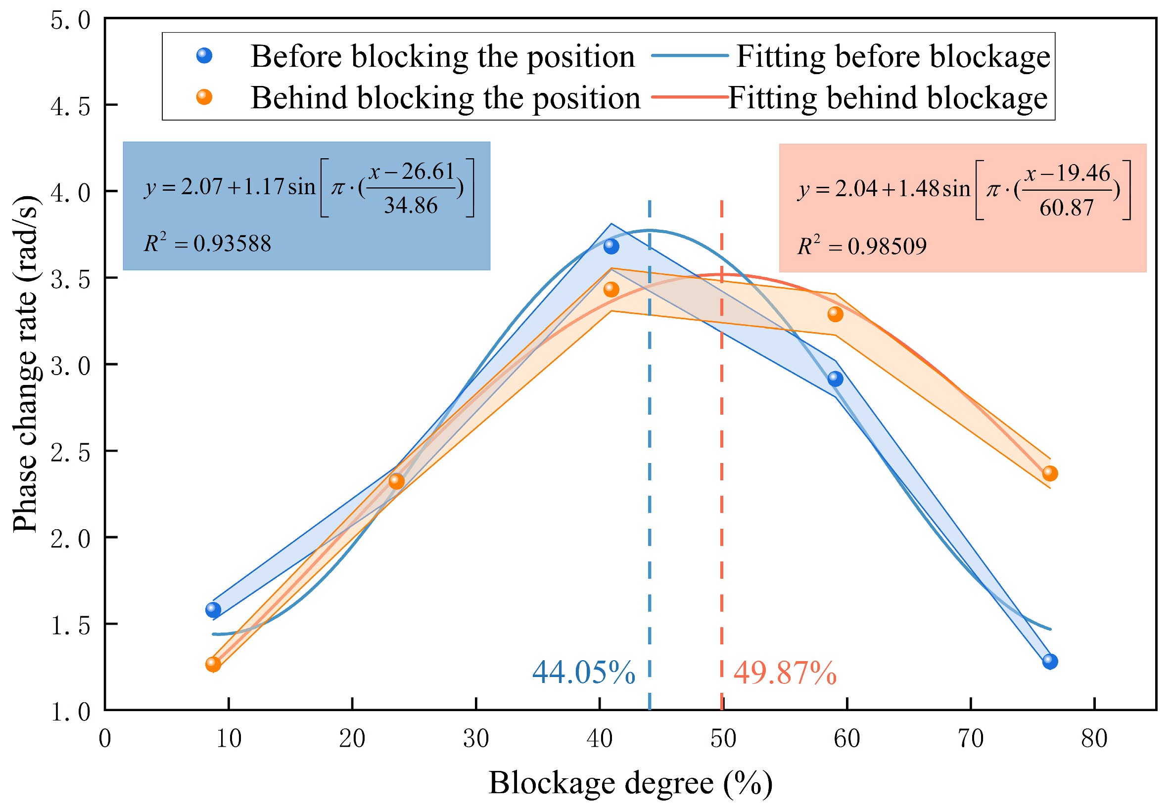 Nonlinear fitting using a sine function was conducted separately for the relationships before and after the blockage point. The sine function was chosen for its physical consistency and superior model performance: the DAS phase change rate exhibits a smooth, unimodal trend with blockage degree, reflecting the physical progression of the blockage-induced flow disturbance and fluid–structure interaction. Alternative nonlinear models, including second- and third-order polynomials and Gaussian functions, were evaluated; the sine function provided the highest goodness of fit while maintaining simplicity with only three parameters. With six gradient blockage degrees spanning the entire test range, the model remains low in complexity and minimizes the risk of overfitting.