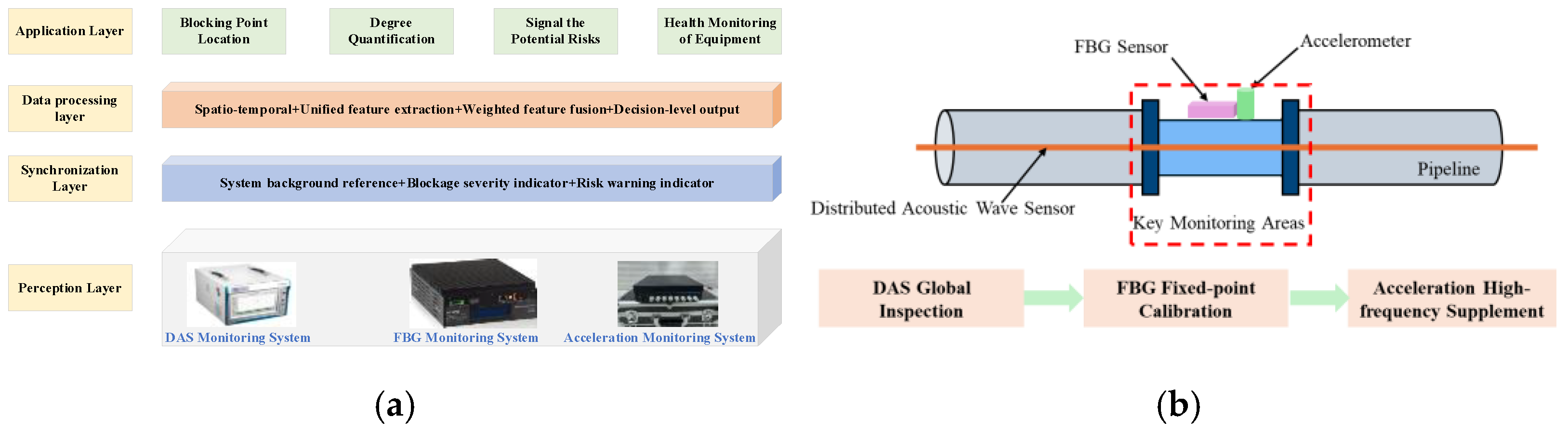 This four-layer architecture integrates the advantages of distributed DAS, high-precision FBG, and high-frequency accelerometers, constructing a unified blockage monitoring framework that balances wide-area coverage and localized accuracy.