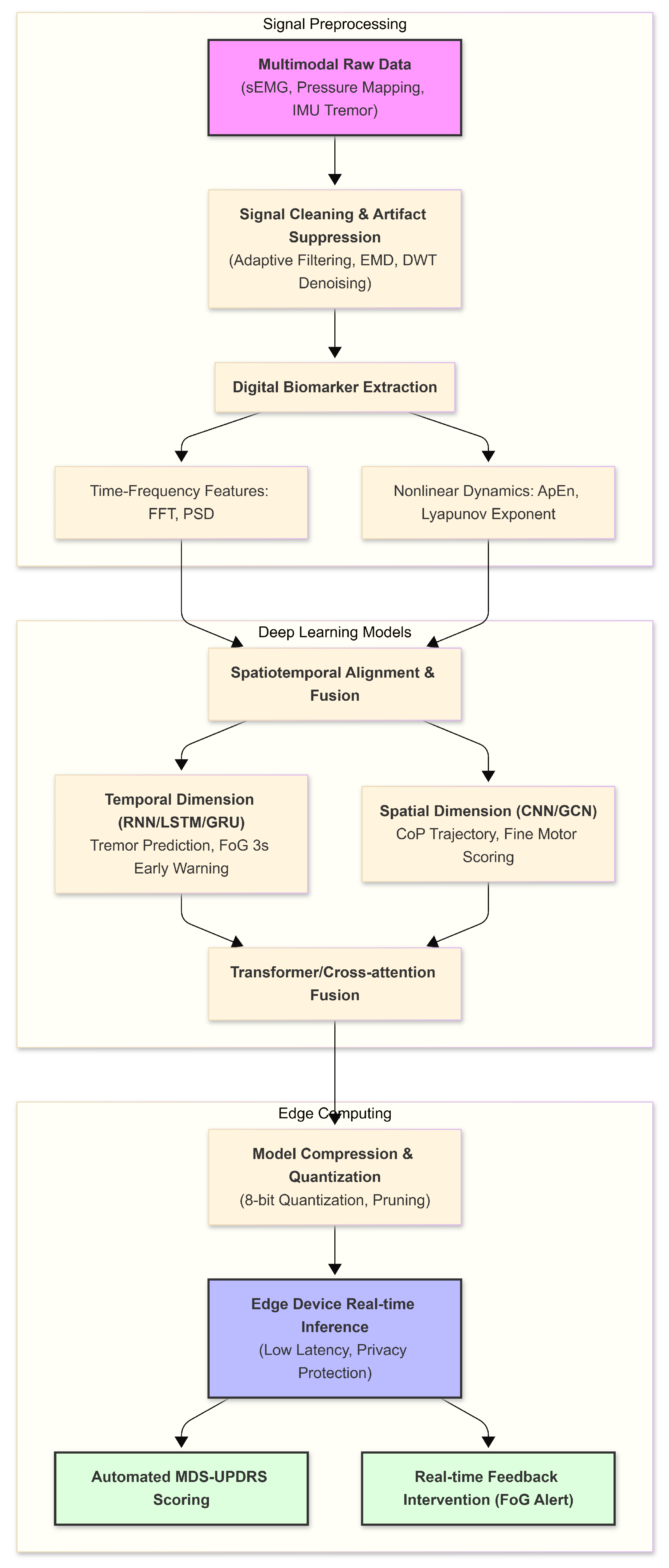 - Software Level: Deep learning models—such as the GRU architecture by Moore and the lightweight Transformer by Yi—have successfully pushed the early warning window for FoG to 3 s prior to onset. Furthermore, by leveraging edge computing technologies (e.g., Chen), inference latency has been compressed to millisecond levels, addressing the real-time processing bottlenecks of wearable devices [31,32,63].