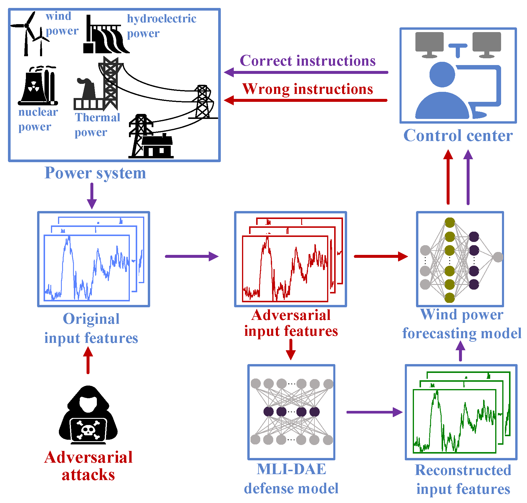 Figure 1. When the wind power forecasting system is subjected to adversarial attacks, the generated adversarial input samples may mislead the forecasting model into producing inaccurate forecasts, potentially causing the control center to issue wrong instructions. However, by leveraging the preprocessing capabilities of the MLI-DAE, these adversarial input samples can be reconstructed into their clean forms. This step enables the control center to maintain correct decision-making and ensure operational integrity.