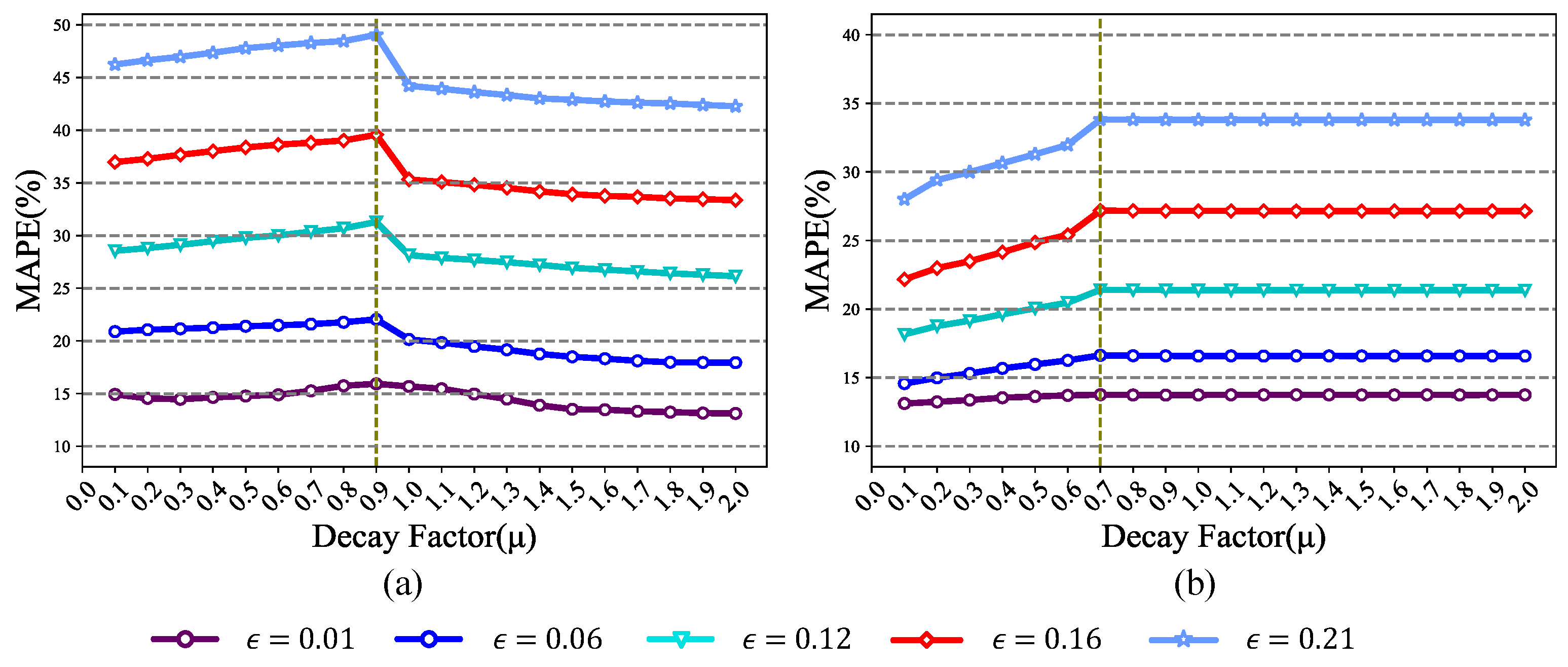 Figure 4 illustrates the attack performance under different momentum decay factors, using the mean absolute percentage error (MAPE) as the evaluation metric. As shown in
