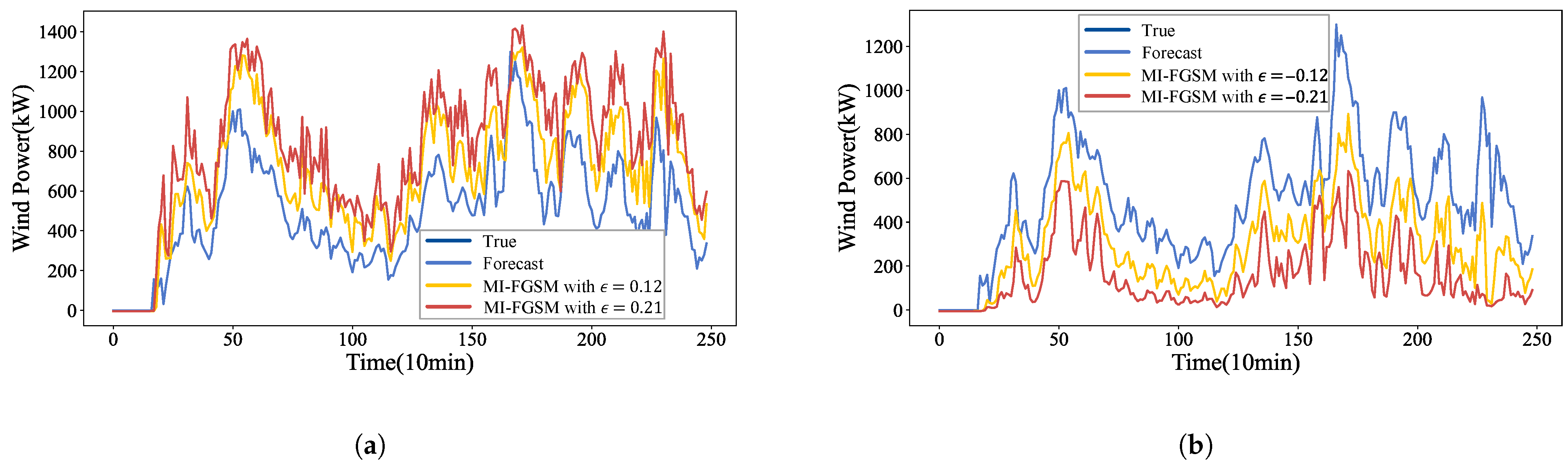 In the white-box environment, attackers leverage full knowledge of the forecasting model’s architecture and parameters to execute the MI-FGSM attack. To visualize the impact of MI-FGSM on wind power forecasting, we show the forecast results post-attack in