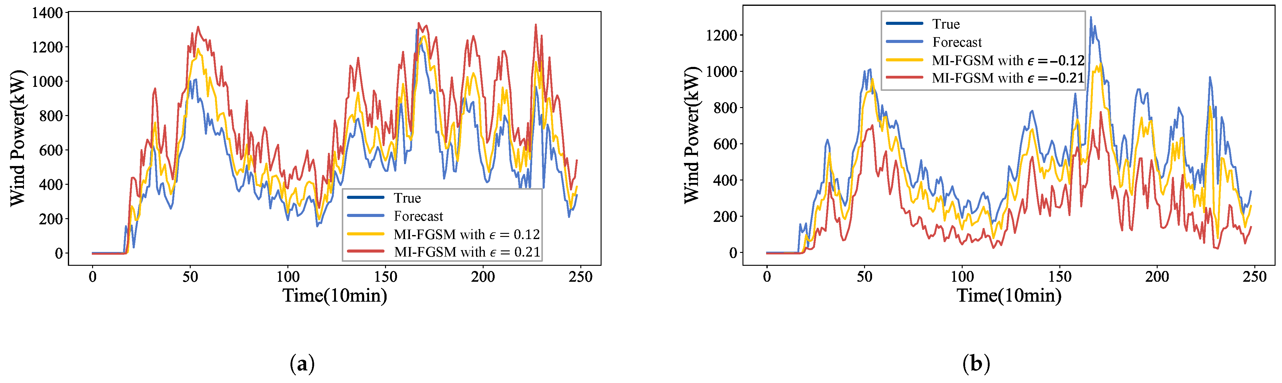 23]. If the input data used for wind power forecasting are compromised by such attacks, the resulting perturbations can lead to degradation in forecasting accuracy, which may have real-world consequences, including inaccurate dispatching, increased reserve requirements, and reduced economic benefits for wind farm operators. In Ref. [
