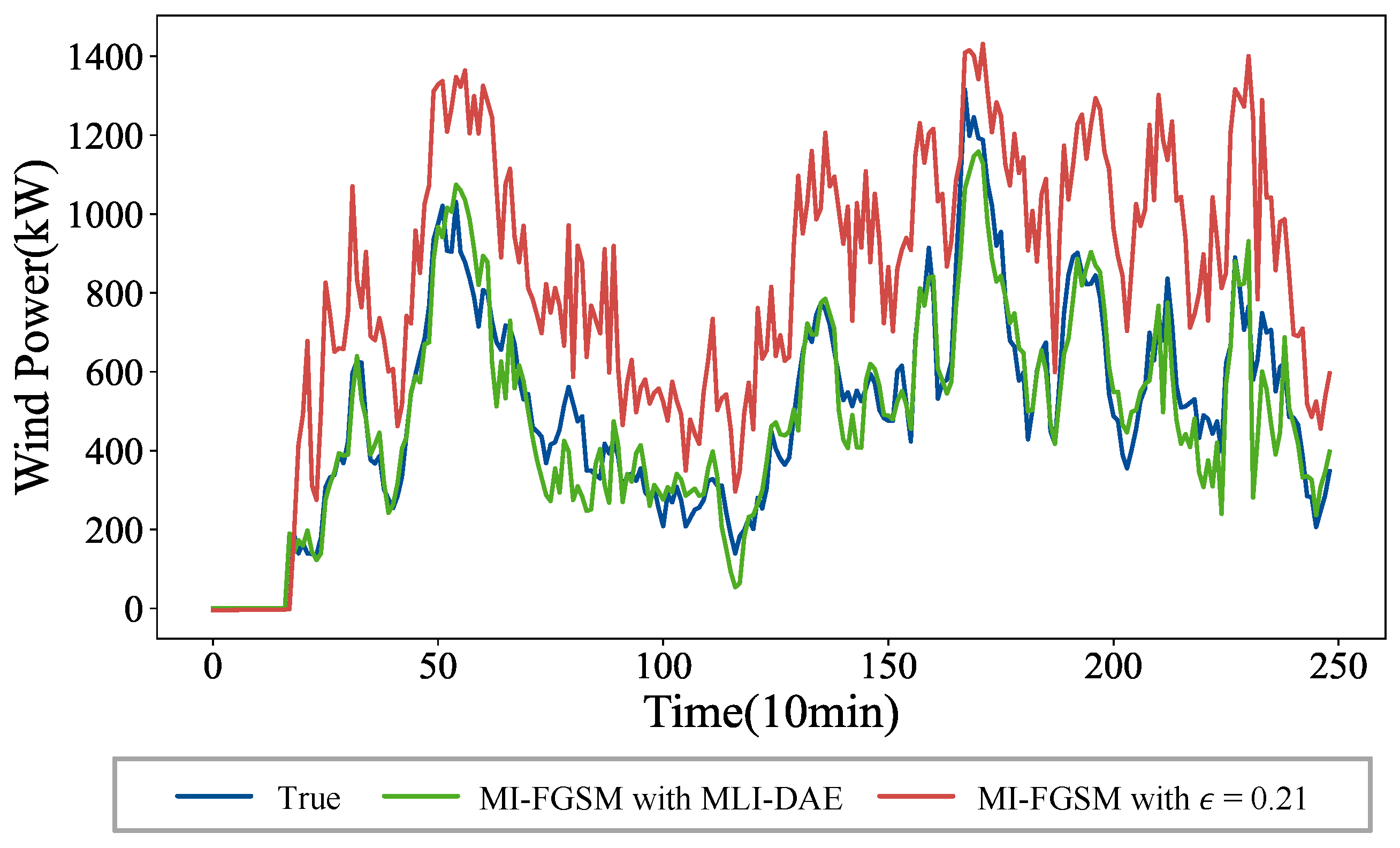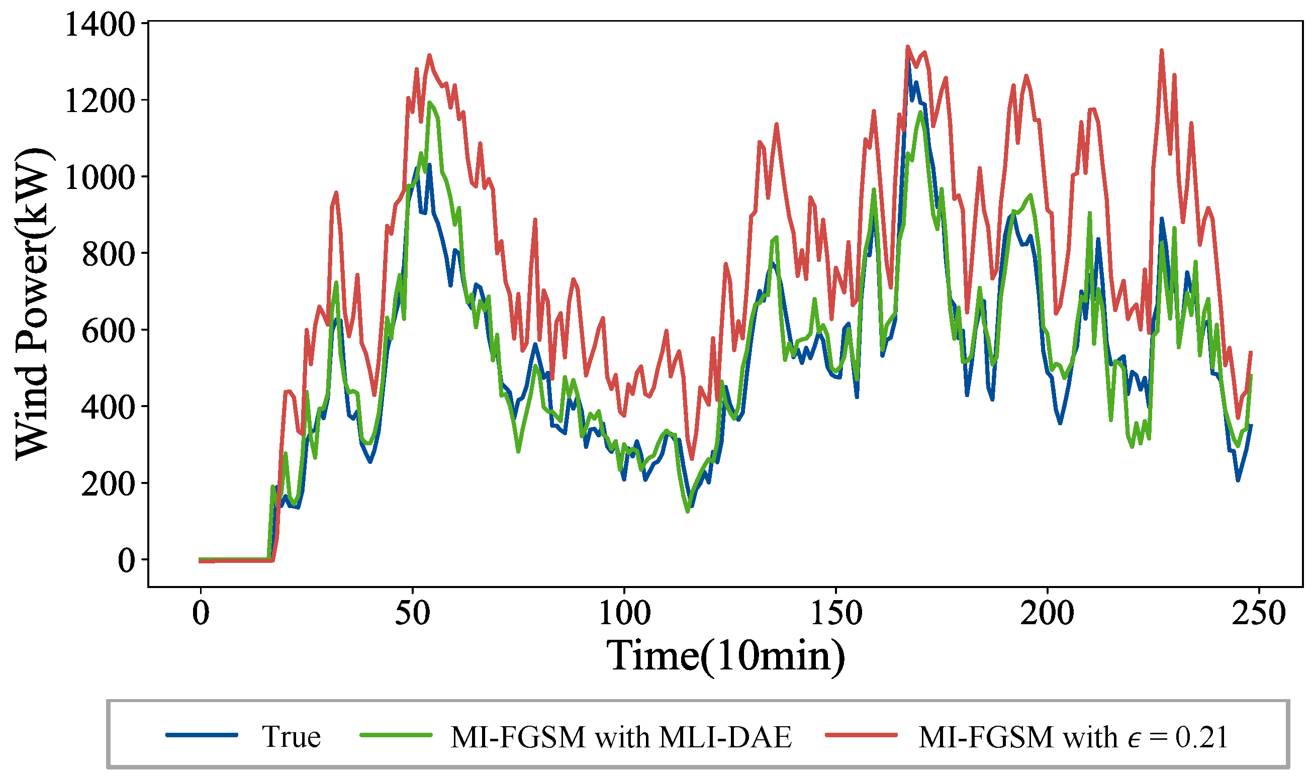 Figure 7 shows the forecast curves under the MI-FGSM white-box attack with a perturbation strength of 0.21. As observed, the attack causes a noticeable deviation in the forecast curves from the original curve. Through the preprocessing stage of MLI-DAE-5, the wind power forecasts, which are maliciously manipulated by MI-FGSM, are effectively restored. The result demonstrates that MLI-DAE can robustly defend against MI-FGSM white-box attacks.
