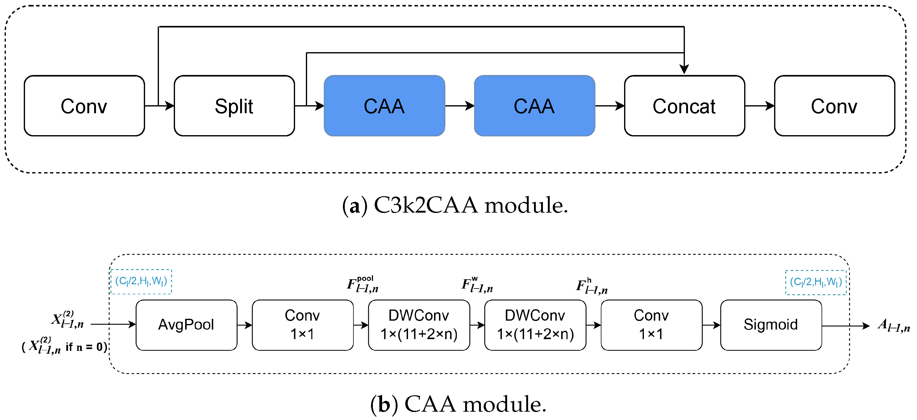- We introduce an improved C3k2CAA module, an attention-augmented structure, to replace the original structure in the backbone network, achieving a reduction of 32.3% parameters while maintaining accuracy.