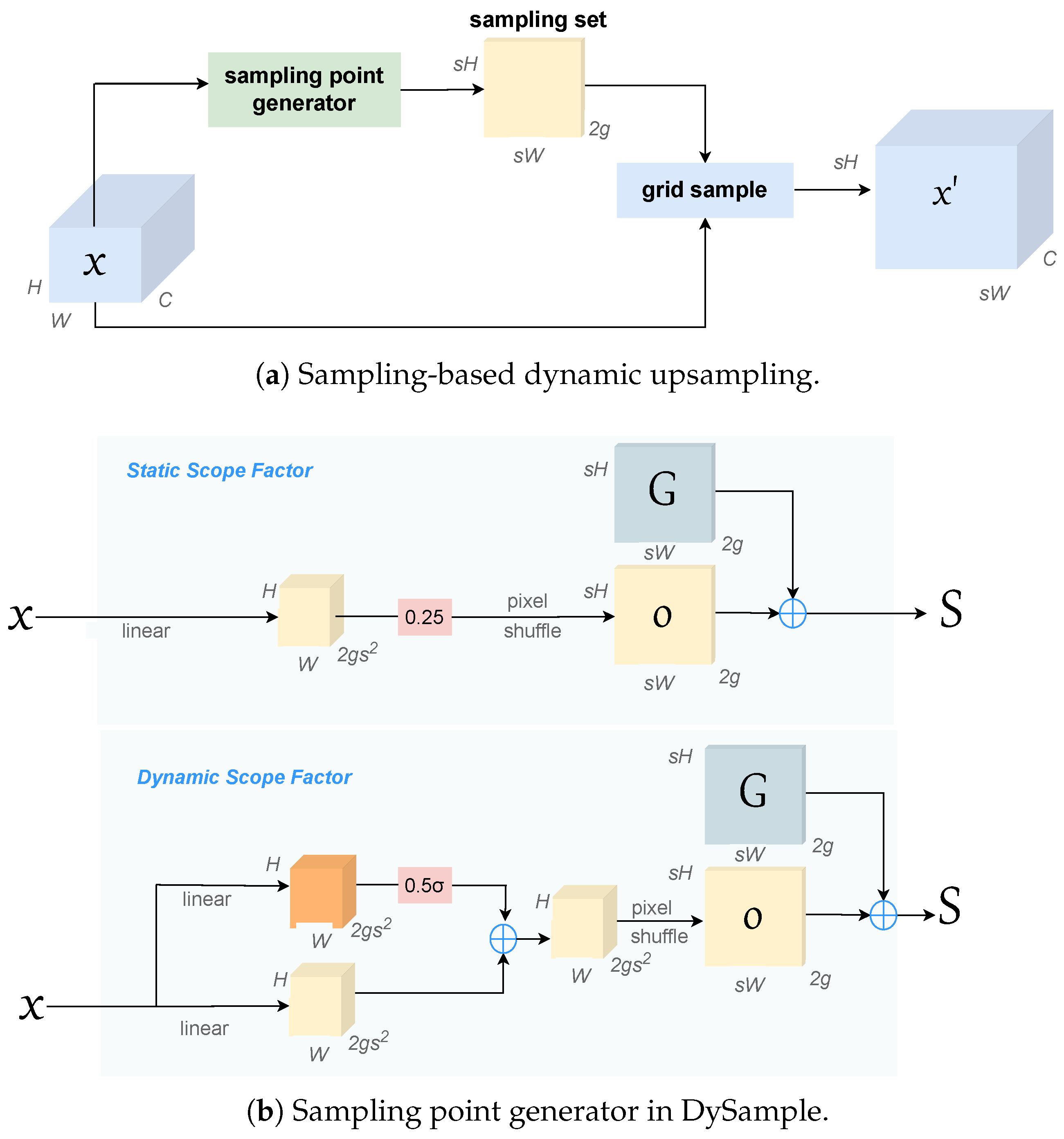 - Liu, W.; Lu, H.; Fu, H.; Cao, Z. Learning to upsample by learning to sample. In Proceedings of the IEEE/CVF International Conference on Computer Vision, Paris, France, 1–6 October 2023. [Google Scholar]