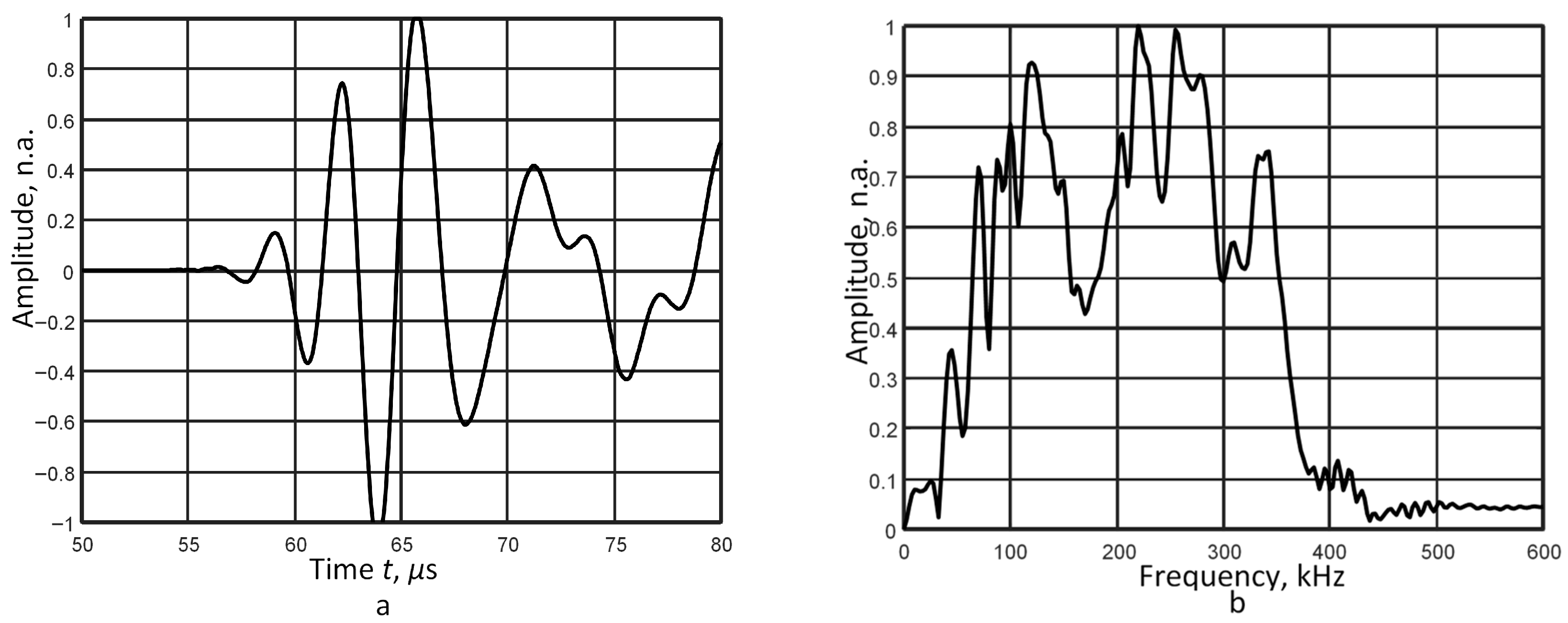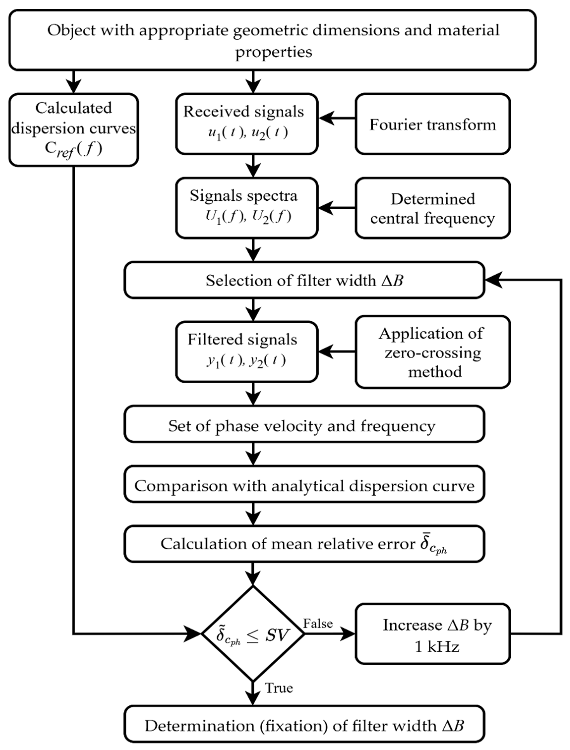- Each time, the result obtained using a different width of the filter bandwidth at the selected central frequency is compared with the calculated analytical dispersion curve. This comparison of the obtained values shows whether the phase velocity is calculated correctly [20]. If the result deviates from the analytical value, the algorithm iterates through the sequence using a modified bandwidth until a match is achieved.