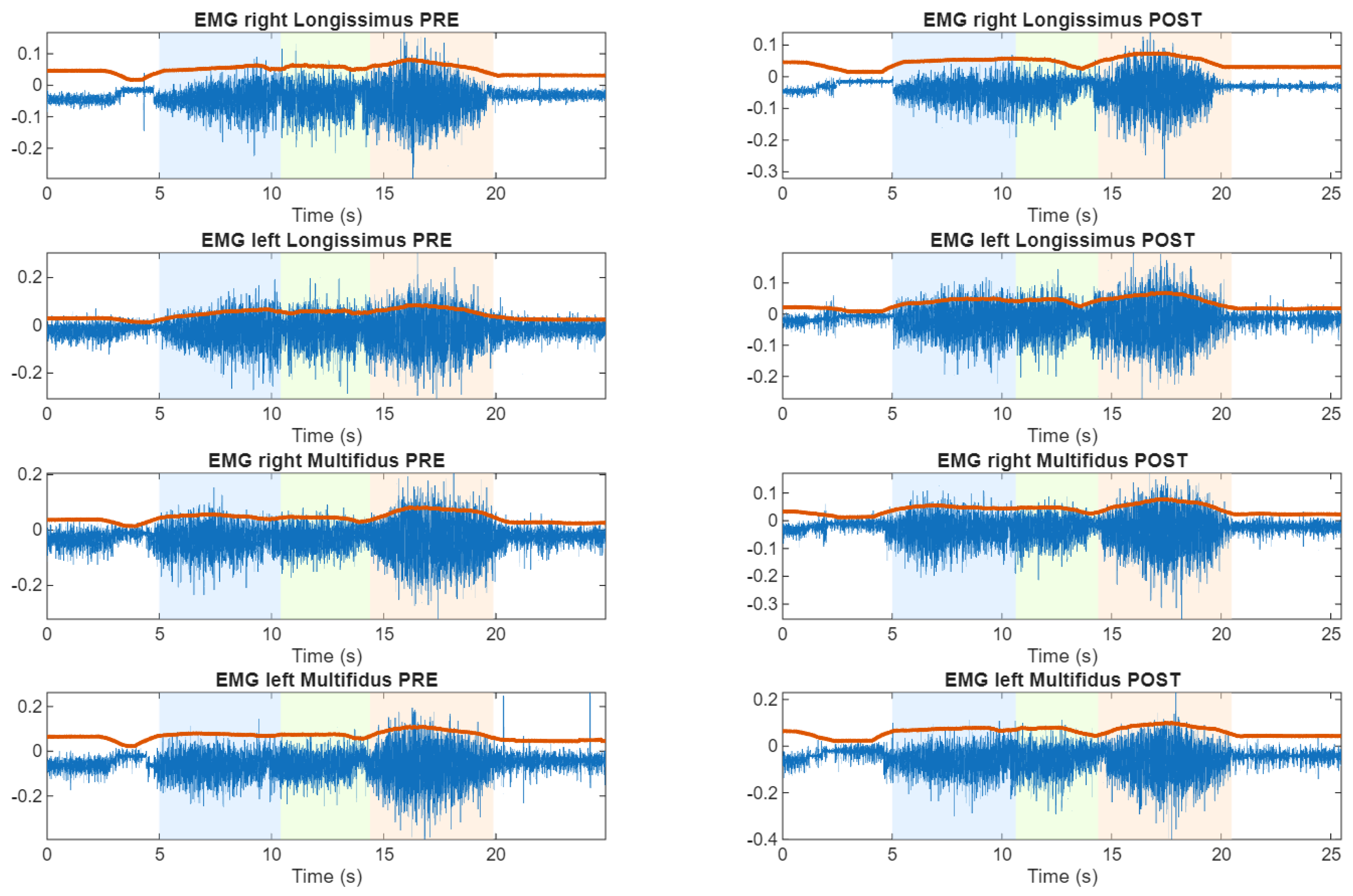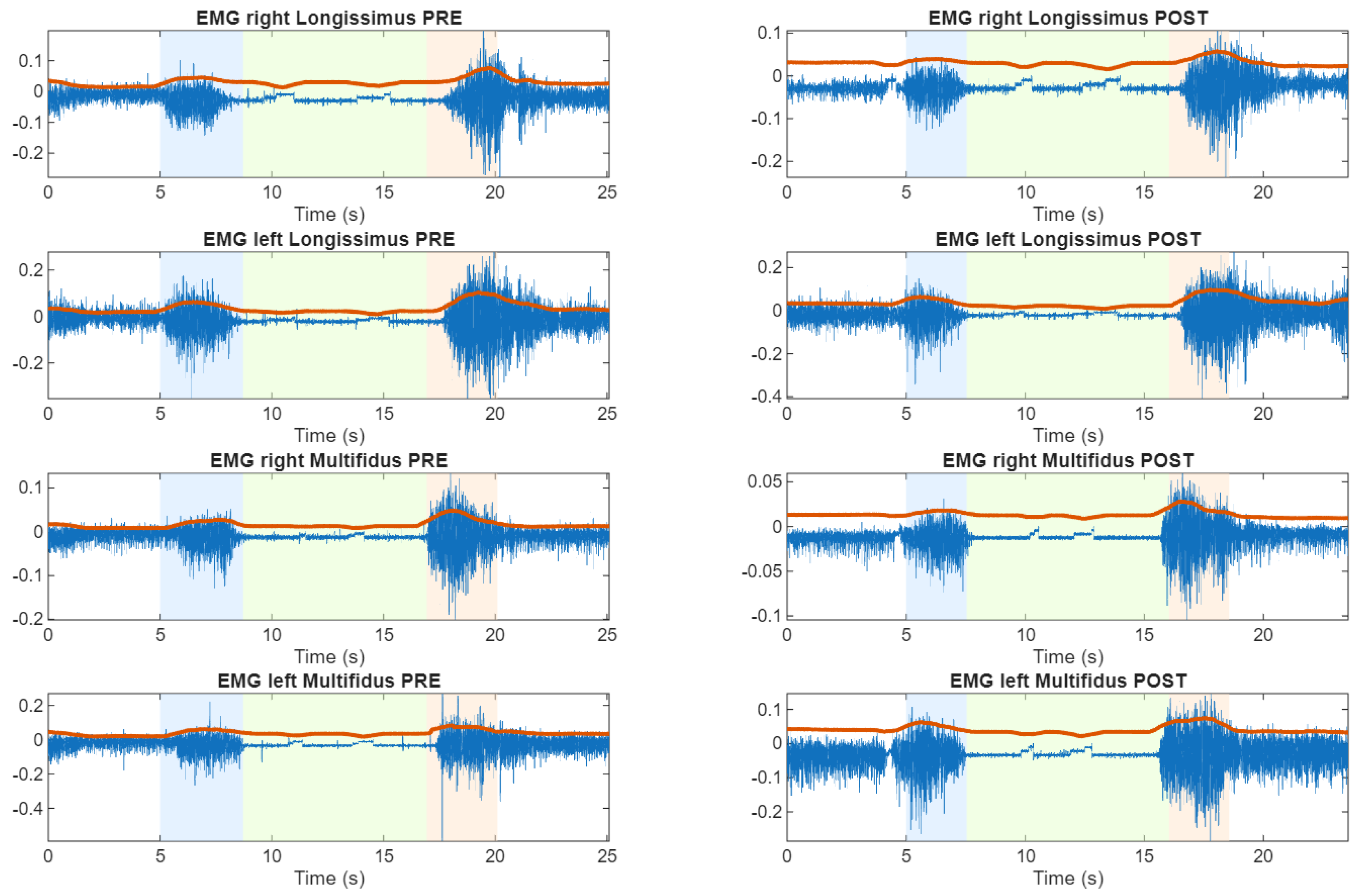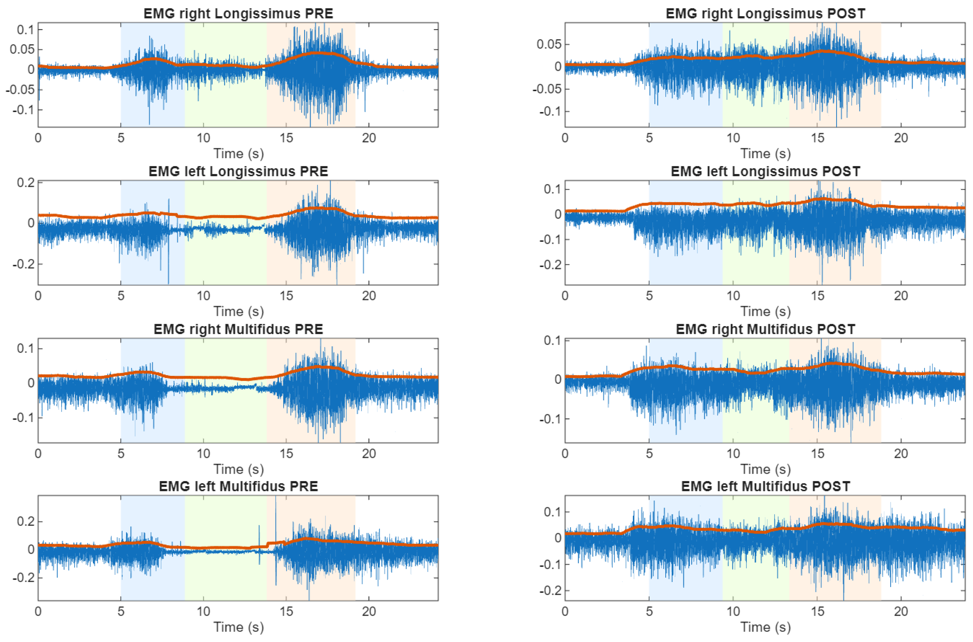 Time representations of lumbar sEMG activity during the flexion–relaxation test. Representative subject (S22) exhibiting persistent sensorimotor disturbance in both pre and post cycling exercise. Here, white area is the rest position, blue area is the flexion transition, green area is the maximum flexion, red area is the extension transition and red line is the envelope of the sEMG.