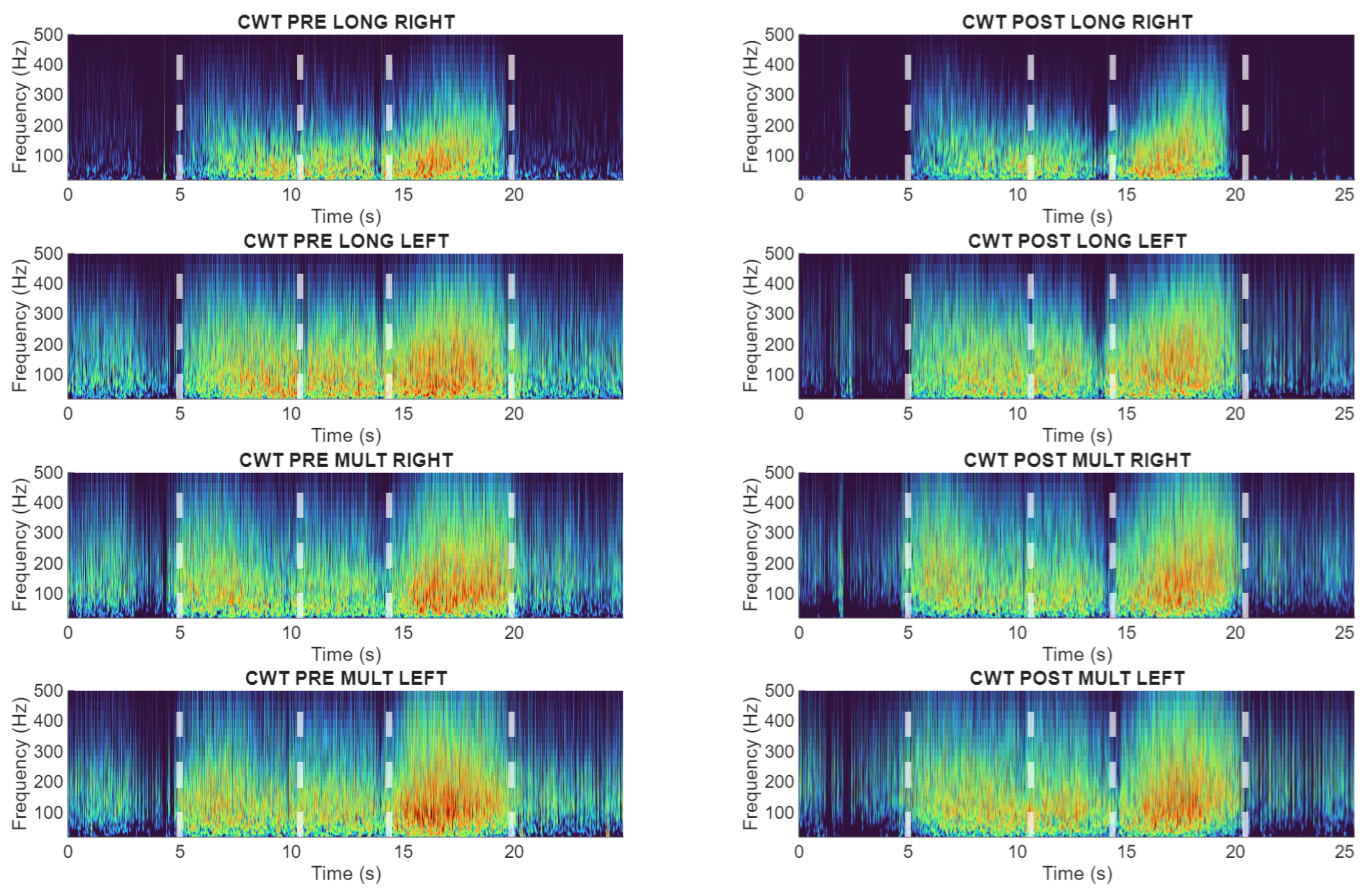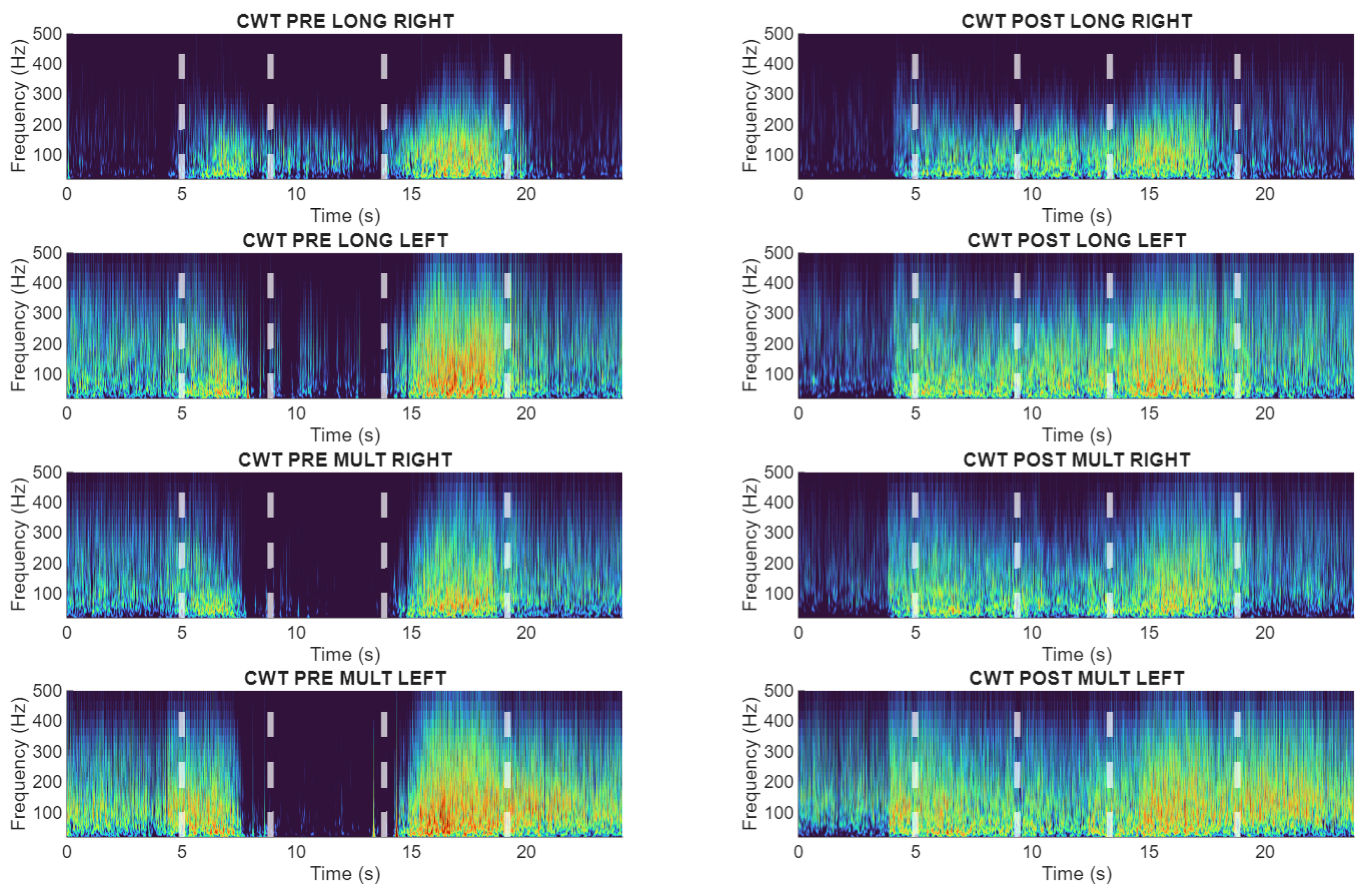 Wavelet-based time-frequency representations of lumbar sEMG activity during the flexion–relaxation test. Representative subject (S22) exhibiting persistent sensorimotor disturbance in both pre and post cycling exercise.