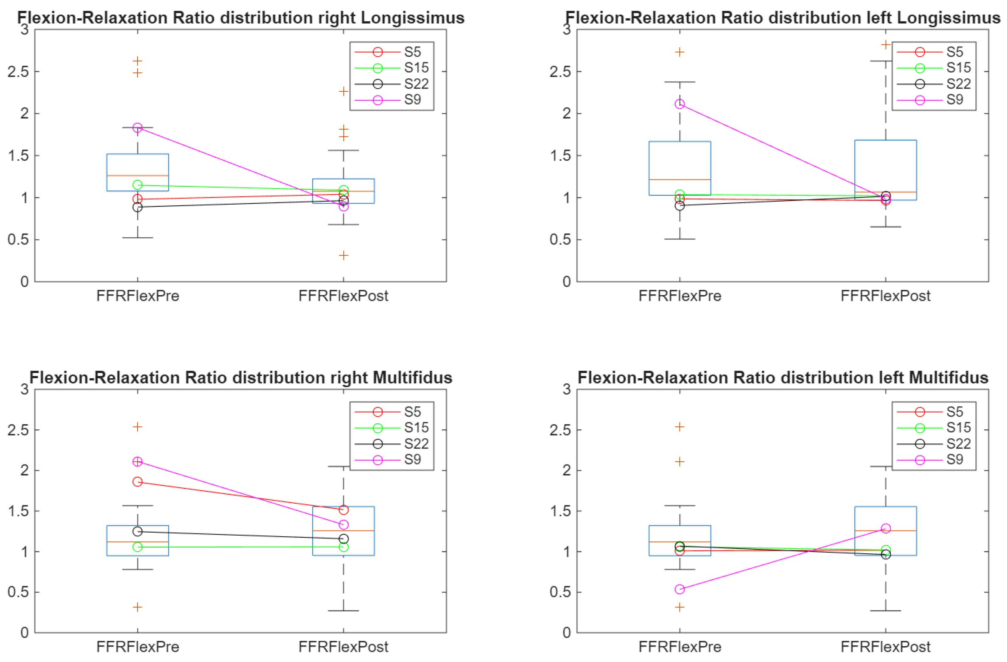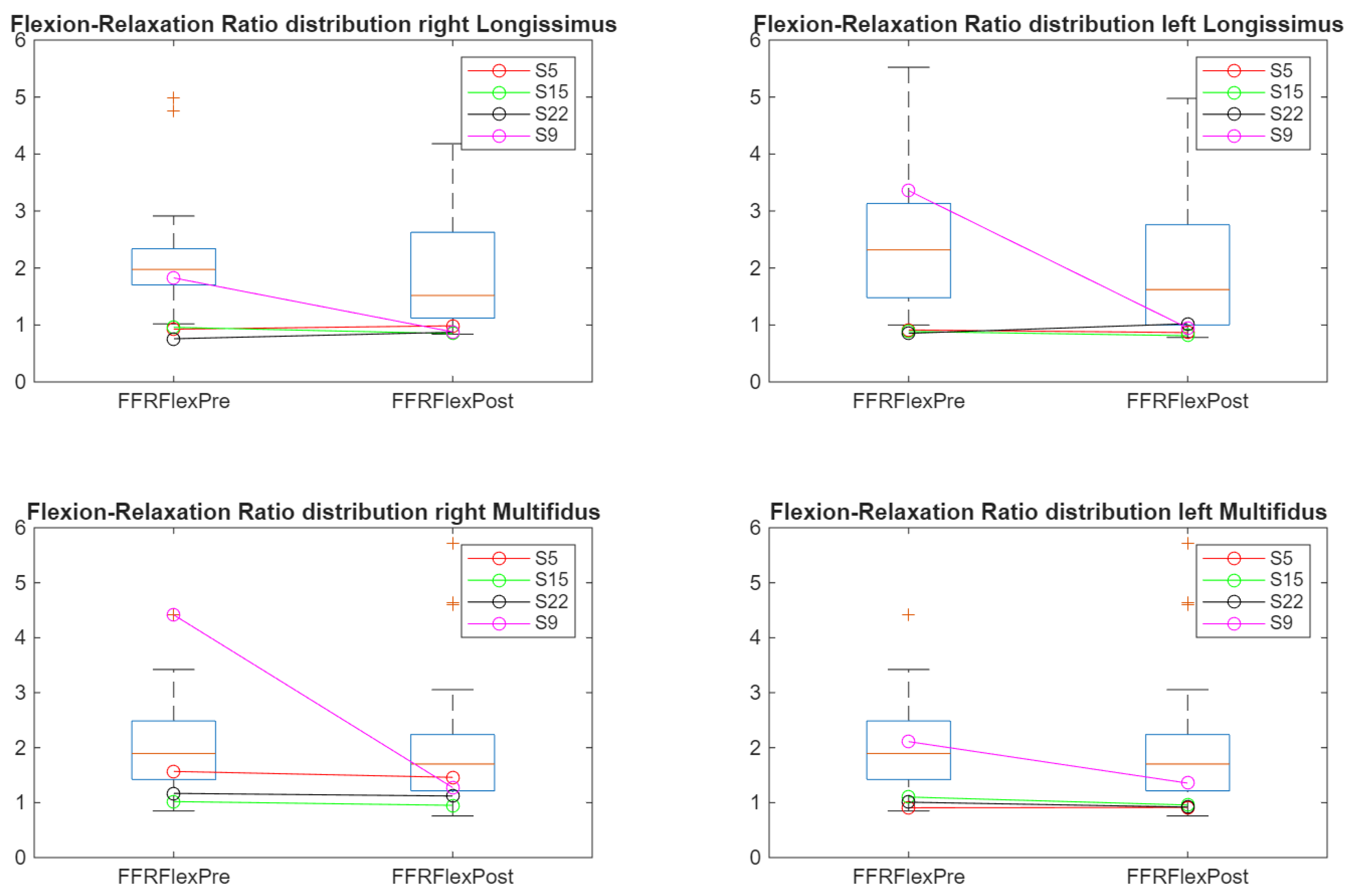 Time-domain flexion–relaxation ratio (FRR) trajectories before and after cycling across lumbar muscles. Individual altered participants are highlighted. “+” indicates outliers.