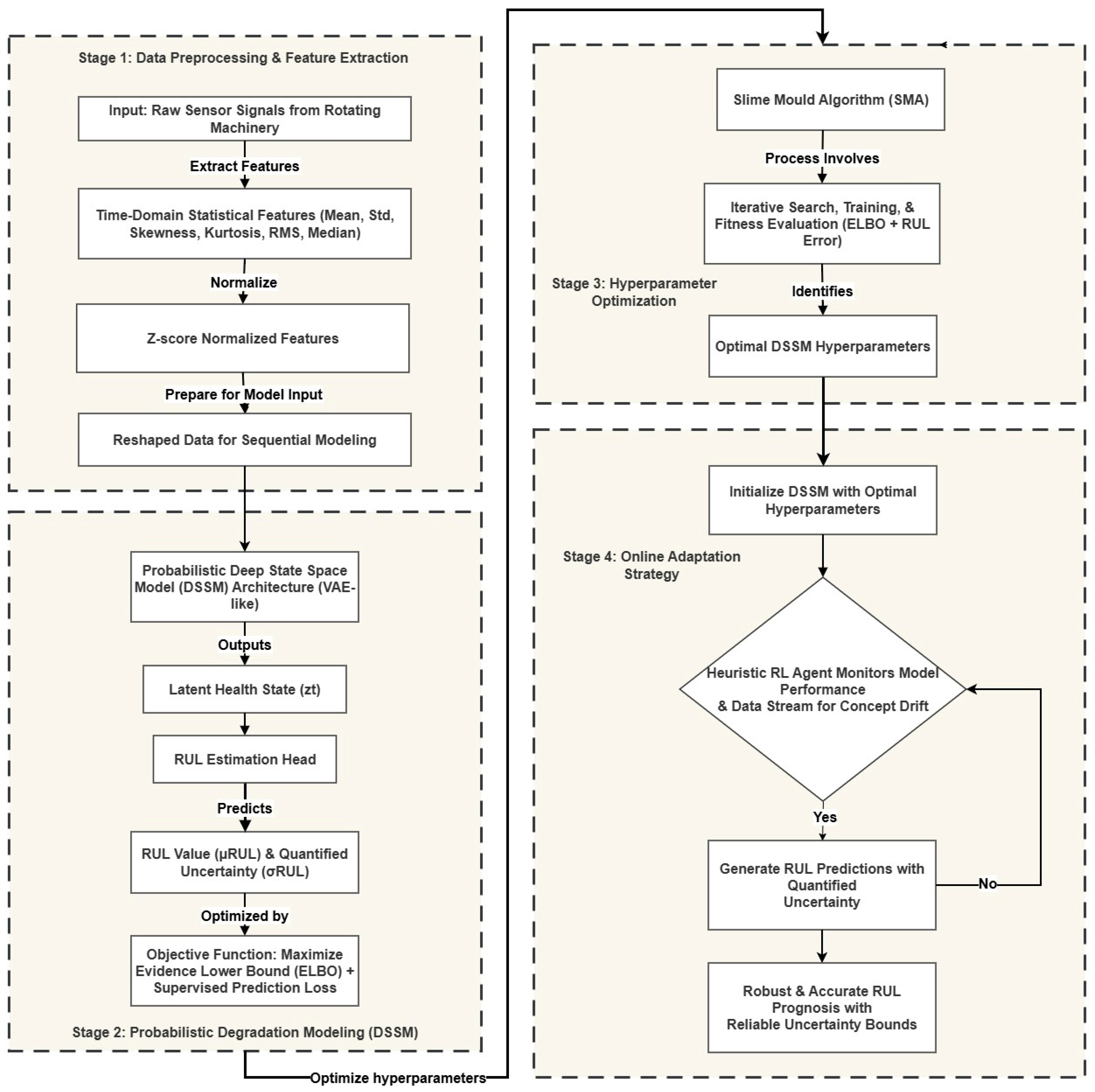 In this section, a comprehensive framework for the RUL prediction of rotating machinery is proposed. The proposed architecture integrates a probabilistic Deep State Space Model (DSSM) for degradation modeling with a meta-heuristic optimization strategy and an online adaptation mechanism. The workflow is illustrated in