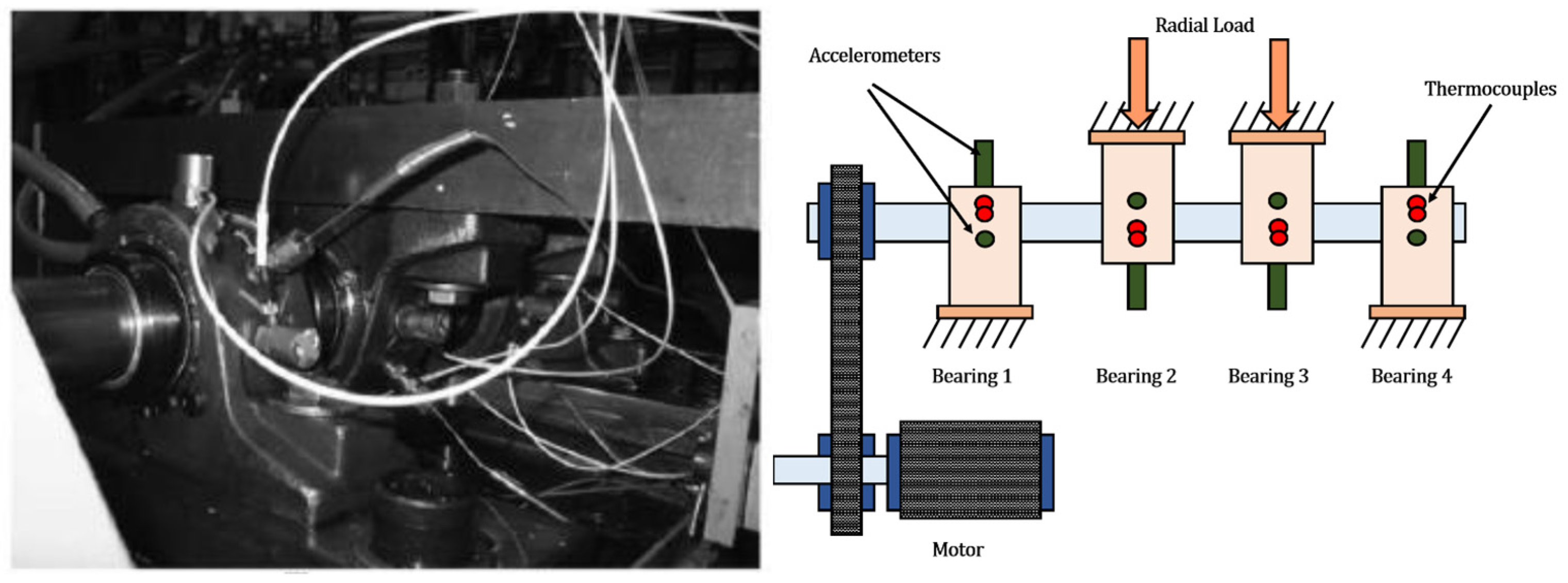Figure 3. A radial load of 6000 lbs was applied to the shaft and bearing by a spring mechanism. Vibration signals were acquired using high-sensitivity accelerometers installed on the bearing housing. The sampling frequency was set to 20 kHz, and data snapshots of 1 s duration were recorded every 10 min.