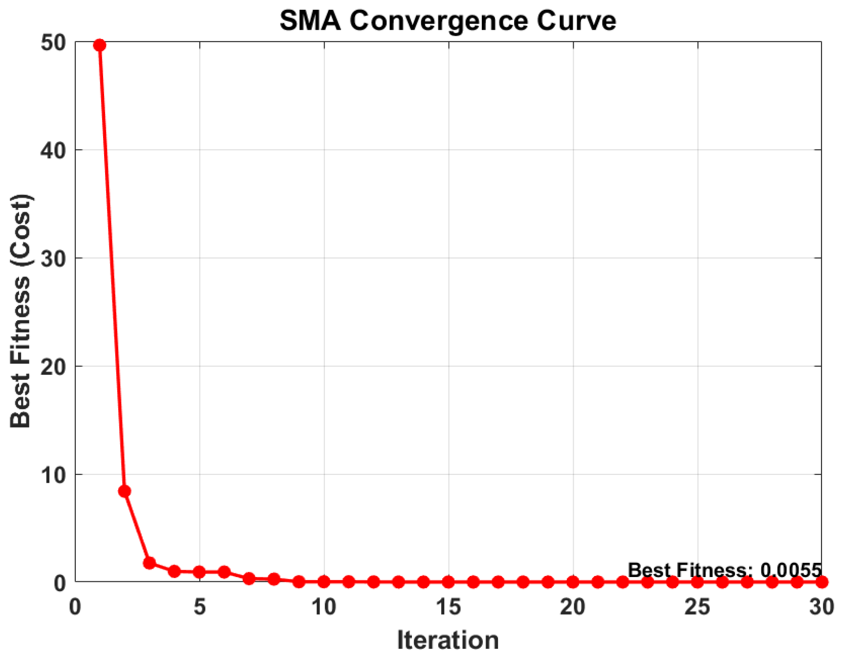 Figure 4 illustrates the convergence trajectory of the SMA over the course of 30 iterations. The curve demonstrates the algorithm’s high efficiency in exploring the search space and exploiting the optimal solution. As observed, the fitness value (cost) exhibits a sharp initial descent, dropping from a high of 0.9275 at iteration 5 to 0.0304 by iteration 10. This rapid convergence indicates that the SMA effectively bypasses local optima in the early stages.