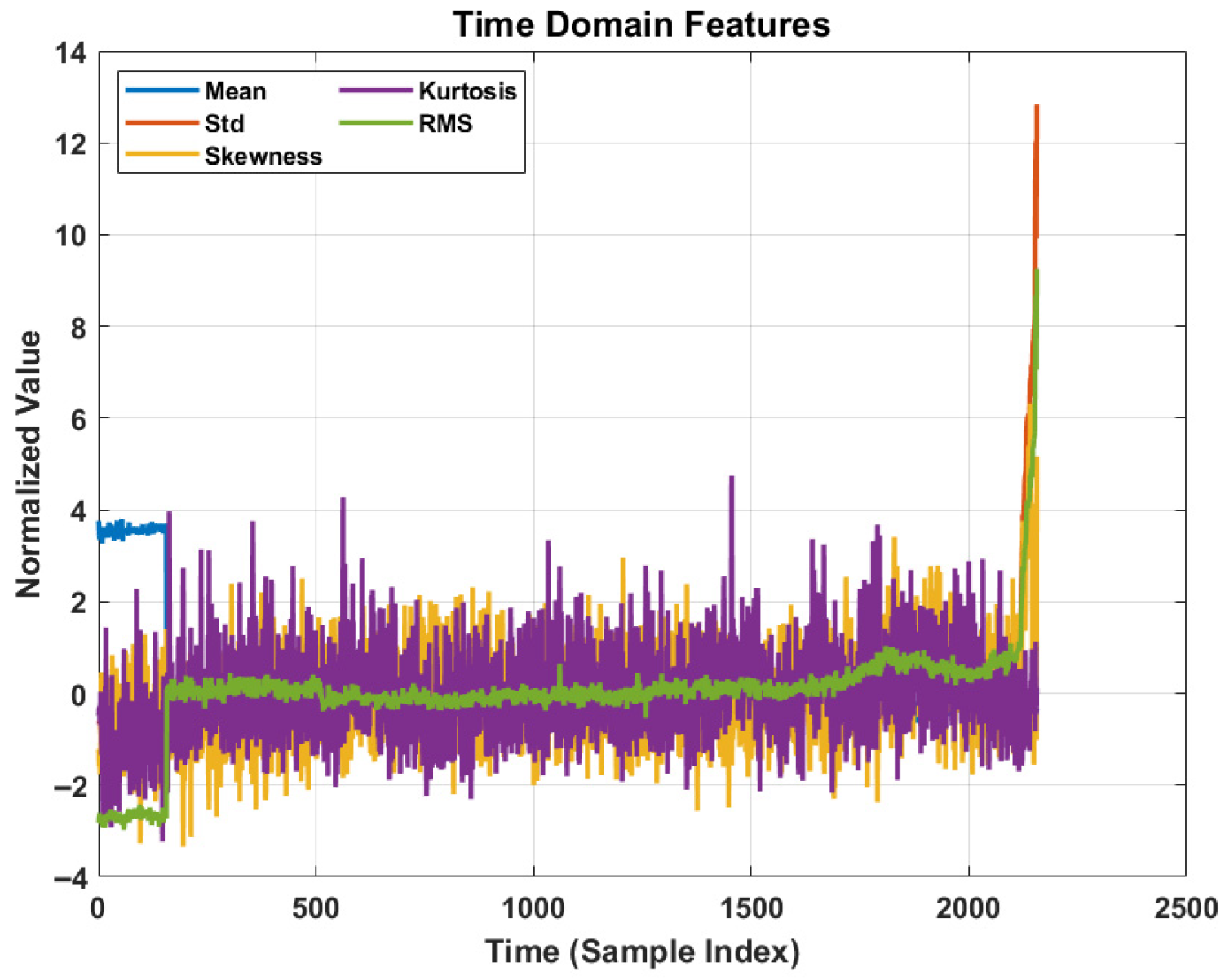 Figure 5 displays the temporal evolution of the five primary time-domain features (Mean, Std, Skewness, Kurtosis, RMS) after normalization. It is evident that during the initial phase (approx. 0 to 500 sample indices), the features exhibit low-amplitude fluctuations, corresponding to the healthy state of the bearing. However, as the degradation propagates, a distinct monotonic increasing trend is observed, particularly in the RMS and Kurtosis values. RMS and Standard Deviation are nearly equivalent and highly correlated. However, in real-world industrial conditions, vibration signals from the IMS bearing test rig exhibit small but non-negligible mean shifts due to sensor DC offsets, asymmetric fault-induced loading, and signal conditioning hardware biases. During advanced degradation stages, the divergence between RMS and Std becomes a meaningful health indicator in itself. Furthermore, the proposed DSSM employs a variational encoder that projects inputs into a regularized low-dimensional latent space, making it inherently robust to correlated features.