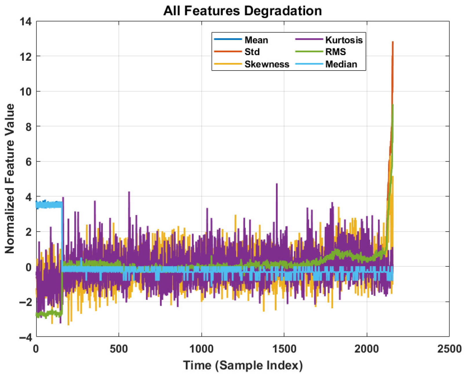 The six statistical time-domain features (mean, standard deviation, skewness, kurtosis, RMS, and Median) have been extracted to construct the health indicator (HI) vector for each time step . These features are selected based on their monotonicity and sensitivity to incipient faults.