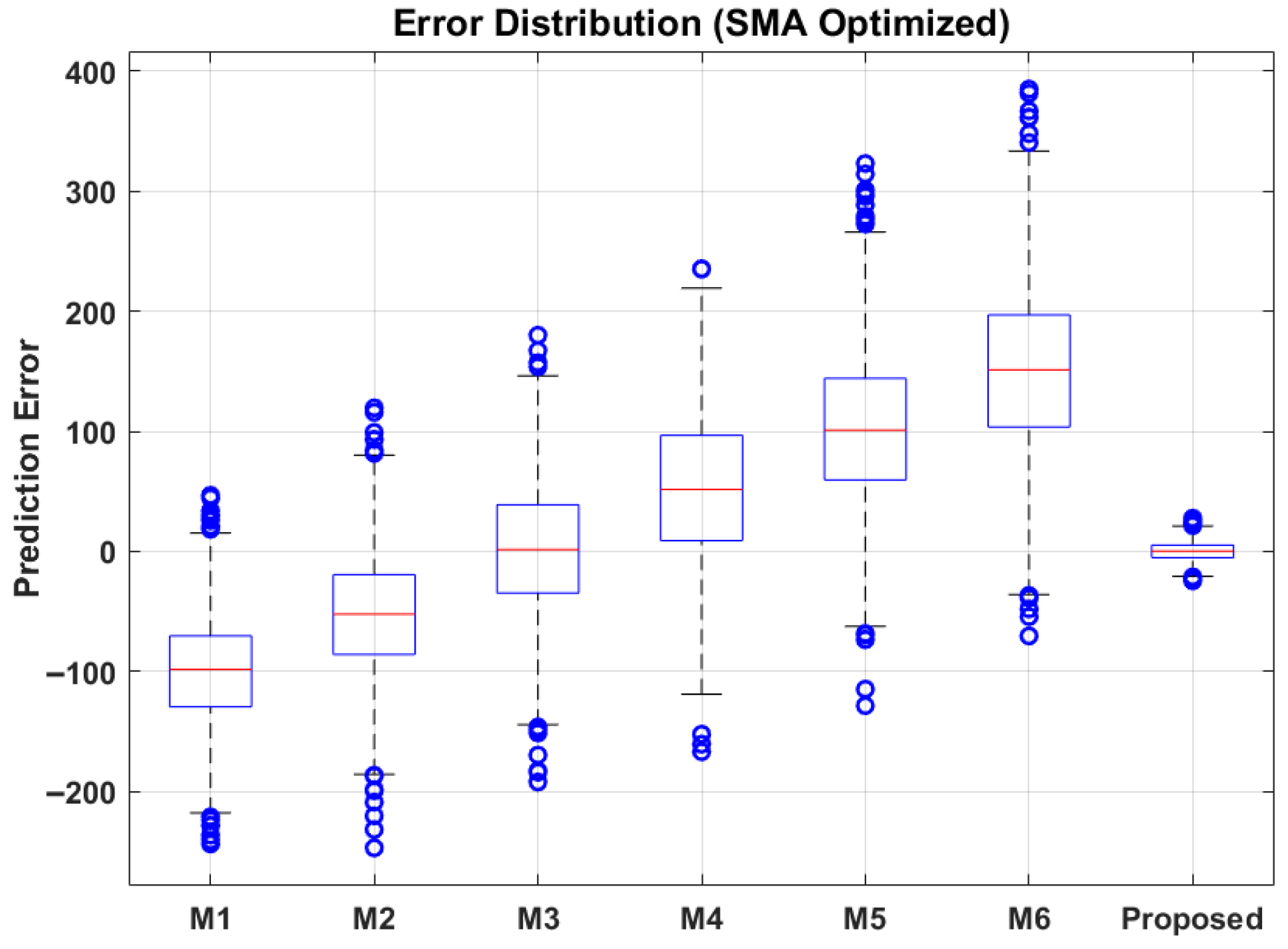 Figure 11 presents the error distribution across methods using boxplots. The boxplot for the proposed methodology shows the most compact interquartile range (IQR), indicating high consistency. The median error is centered near zero, demonstrating low bias. In contrast, methods M1 and M2 exhibit large spreads and numerous outliers, indicating poor generalization to the stochastic nature of the IMS dataset.
