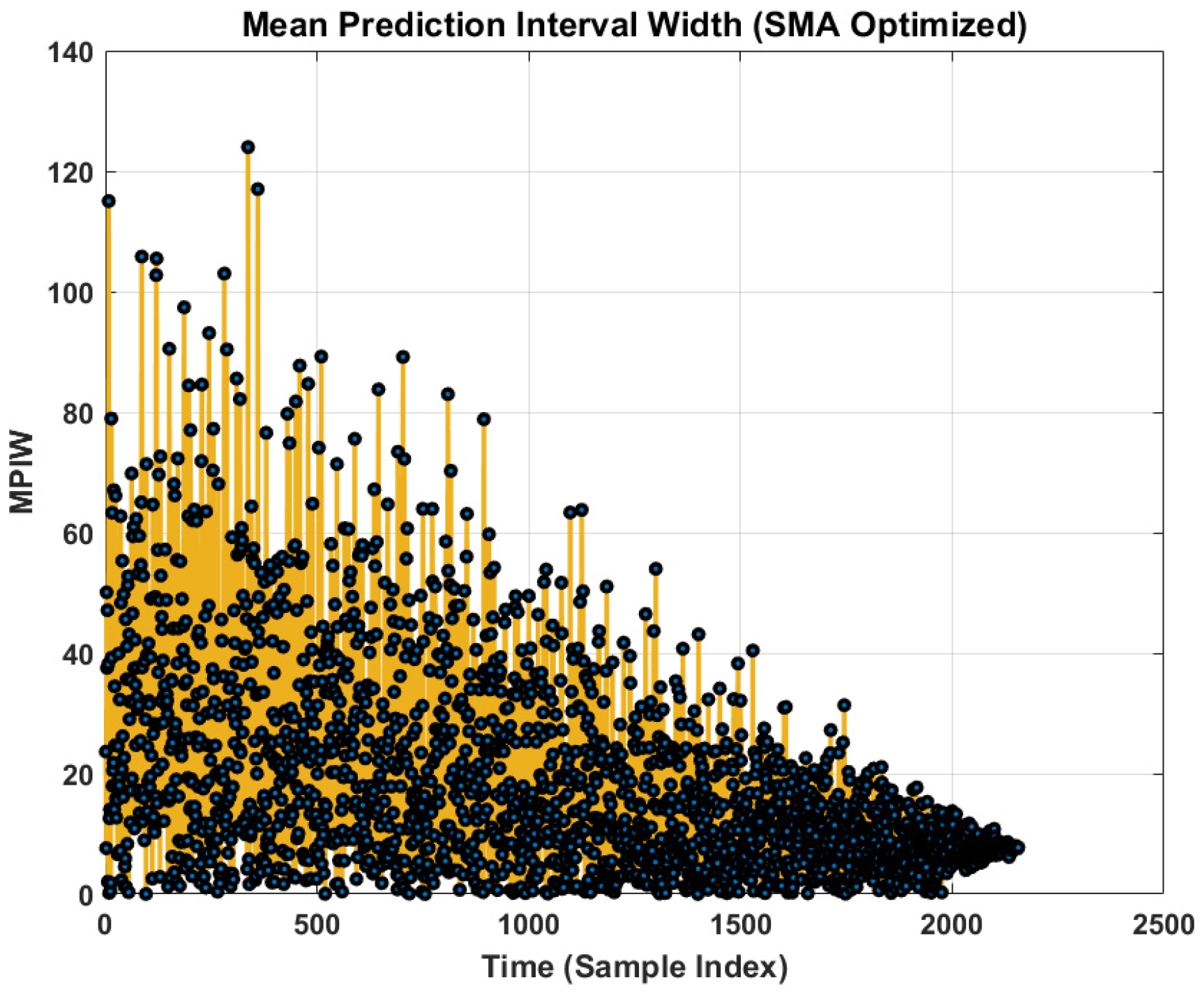 Figure 13 illustrates the MPIW over time. The MPIW represents the “sharpness” of the prediction. A narrower interval indicates higher confidence. The plot shows a decreasing trend in MPIW as the time index increases. This confirms the observation from the PDF plot (