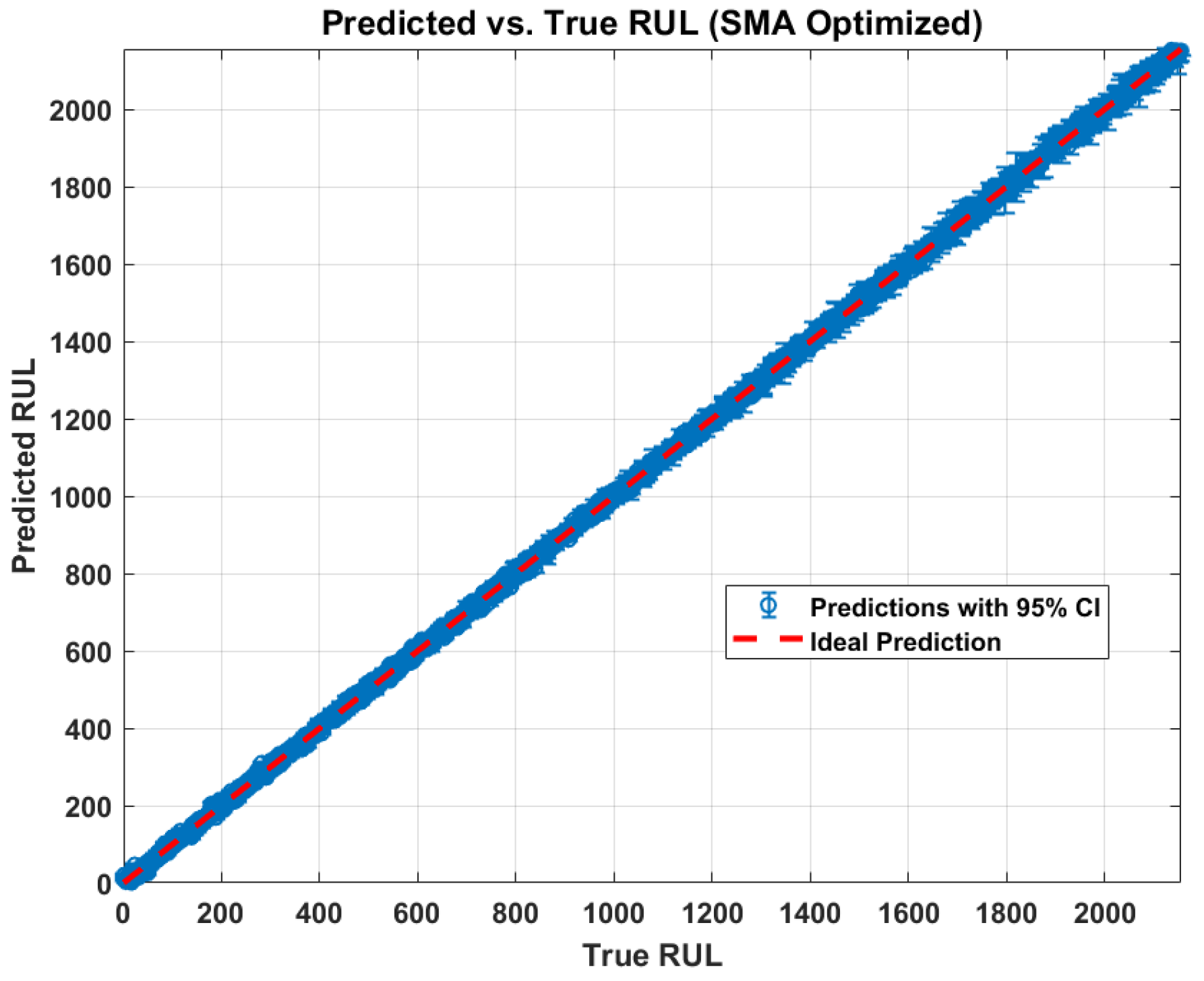 Figure 14 plots the predicted vs. true RUL, where the red dashed line is the ideal reference. The blue markers are the predictions, with vertical bars representing the 95% confidence interval. The tight alignment of the blue markers along the red diagonal confirms high accuracy. The length of the error bars visually represents the uncertainty at each point. It can be observed that for the majority of the lifecycle, the true RUL is encapsulated within these bounds, further validating the robustness of the proposed framework.