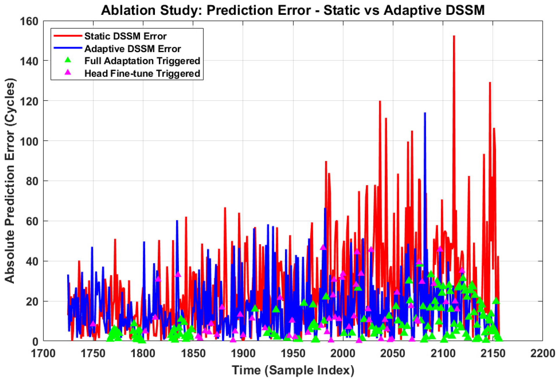 Figure 16 presents the absolute prediction error over time for both configurations. The Static DSSM exhibits a monotonically increasing error trend beyond cycle 1900, with peak errors exceeding 150 cycles near the end of life. In contrast, the Adaptive DSSM maintains consistently lower error throughout the test partition. The green and magenta triangles indicate time steps where the RL agent triggered Full Adaptation (Action 2) and Head Fine-tune (Action 1) respectively, demonstrating that adaptation actions are correctly concentrated in the high-error late degradation phase.