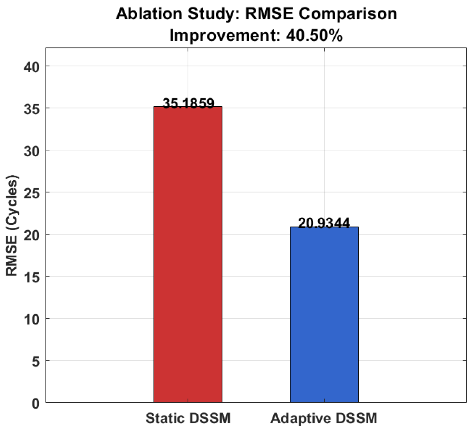 However, during the critical late degradation phase, the Static DSSM RMSE increases dramatically to 44.084 cycles due to concept drift, while the Adaptive DSSM maintains a significantly lower RMSE of 22.662 cycles, representing a 48.58% improvement in the most critical operational phase.
