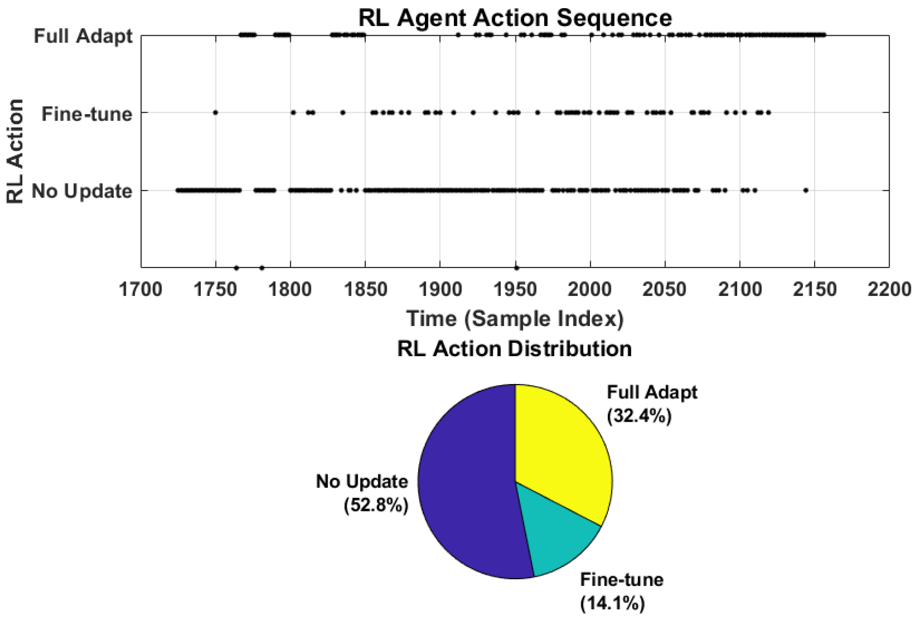 Table 8 presents the RL agent action distribution during the testing phase. The agent selected Action 0 (No Update) for 52.78% of time steps, indicating stable operation during the early degradation phase where model parameters remain valid. Action 2 (Full Adaptation) was triggered for 32.41% of steps, predominantly during the rapid degradation phase where significant concept drift was detected. Action 1 (Fine-tune Heads) accounted for 14.12% of steps, representing intermediate distributional shifts requiring partial model updates. This intelligent action allocation confirms that the RL agent correctly identifies and responds to varying levels of concept drift.