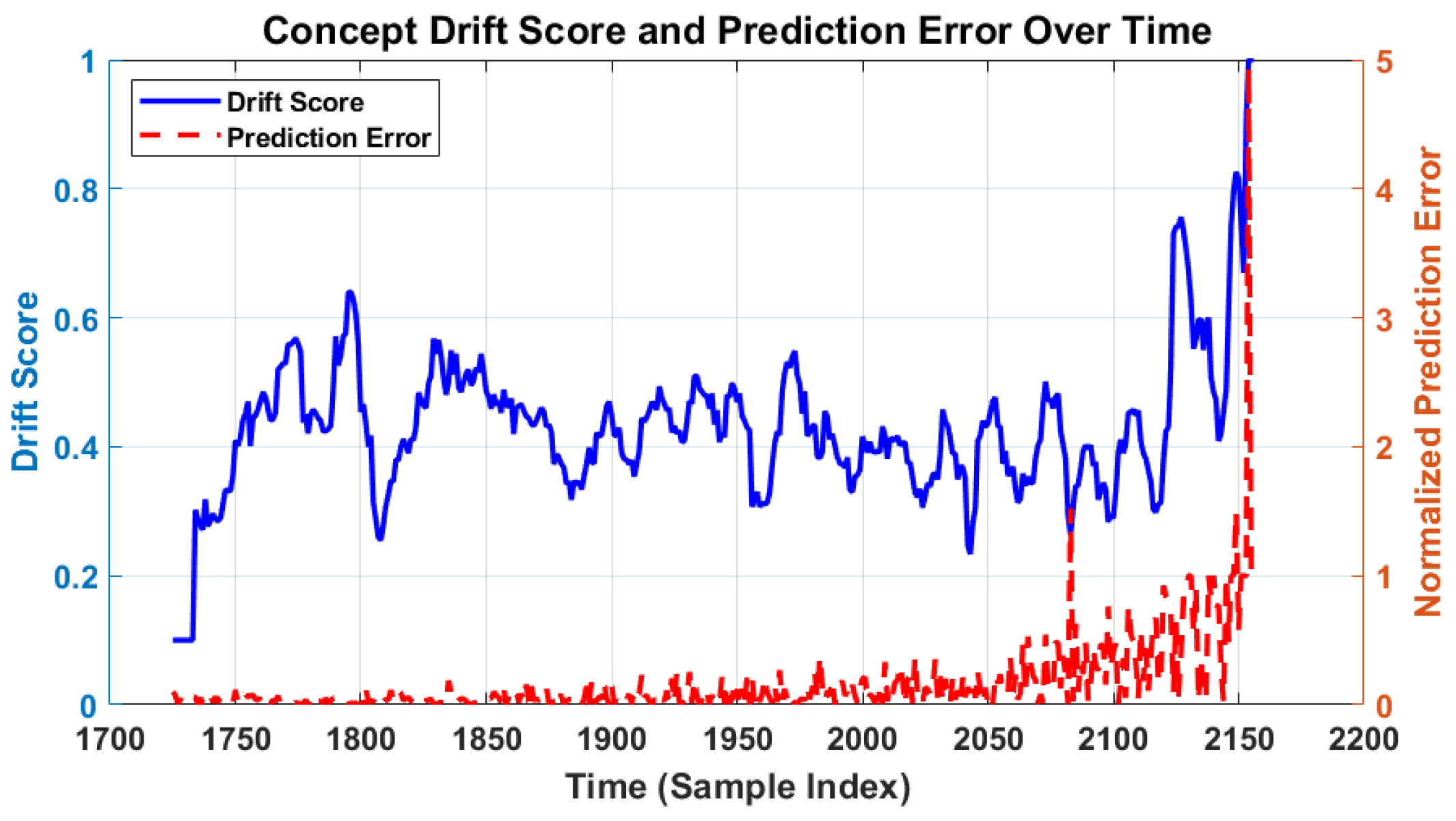 Figure 19 presents the concept drift score and normalized prediction error over the test partition. The drift score shows a clear increasing trend beyond cycle 2080, with a sharp rise approaching the end of life. A strong correlation between the rising drift score and increasing prediction error confirms that the online adaptation mechanism is correctly triggered in response to genuine distributional shifts in the degradation signal.