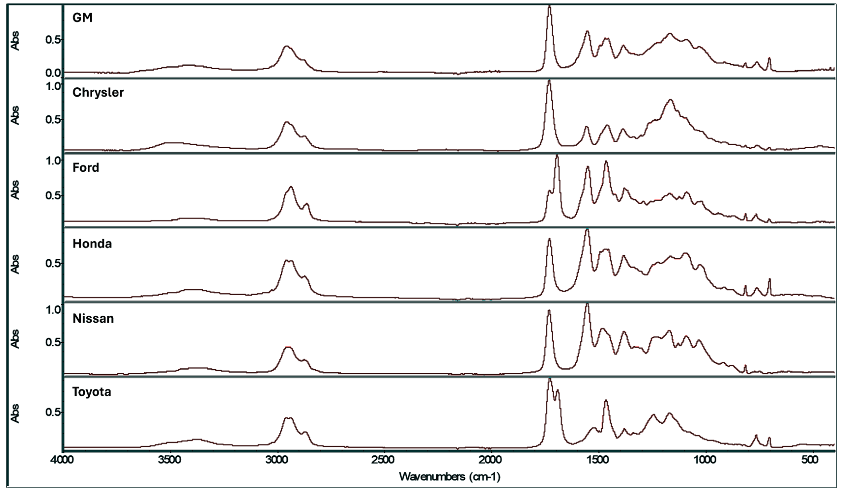 Figure 1 shows frequency-normalized clear coat IR spectra representative of the six automotive manufacturers (General Motors, Chrysler, Ford, Honda, Nissan, Toyota).