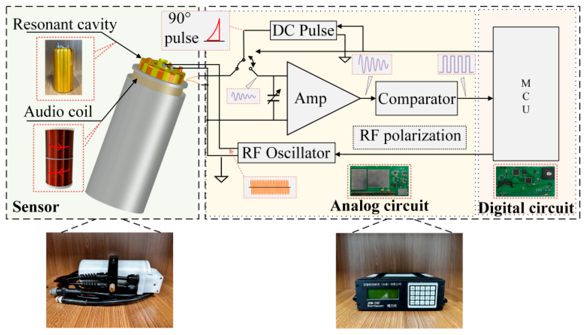 - Ge, J.; Yu, H.; Luo, W.; Shen, Y.; Dong, H.; Liu, Z. A Novel Coil-Based Overhauser Vector Magnetometer for the Automatic Measurement of Absolute Geomagnetic Total Field and Directions. IEEE/ASME Trans. Mechatron. 2024, 29, 1634–1646. [Google Scholar] [CrossRef]
