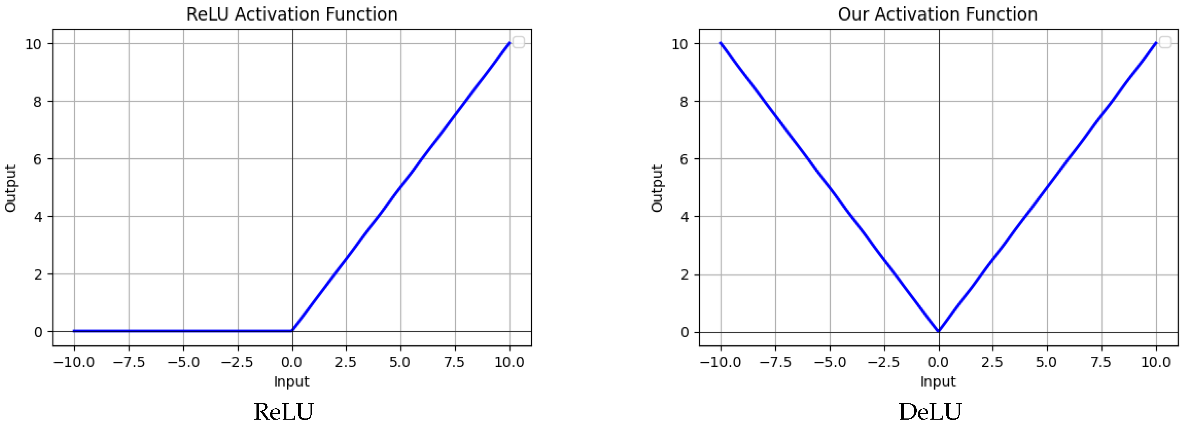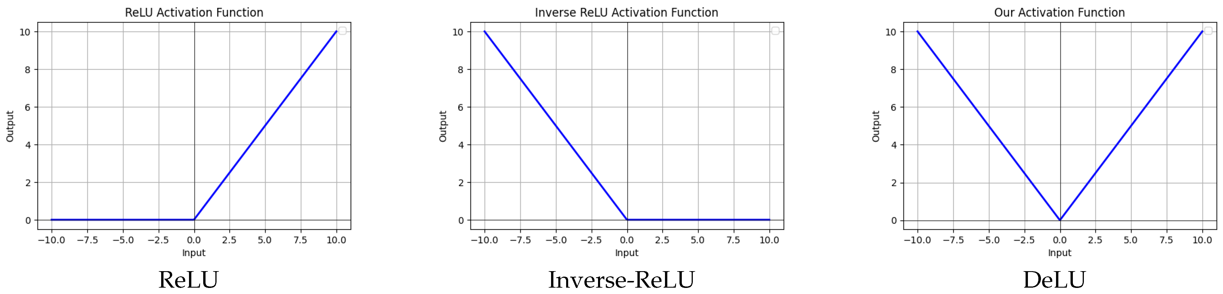 We compare DeLU with classical ReLU and its variant Leaky ReLU to highlight its unique characteristics. Unlike ReLU and its variants, which utilize a dead region to produce nonlinear features, DeLU incorporates an absolute value operation to provide nonlinearity, along with the hyperparameters