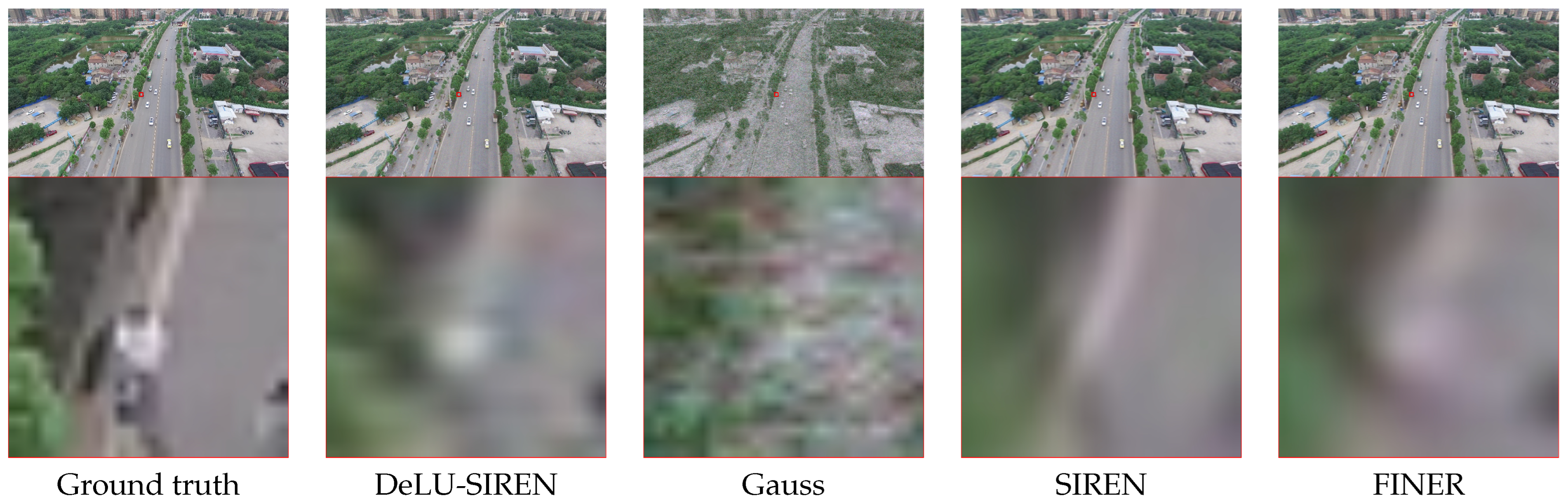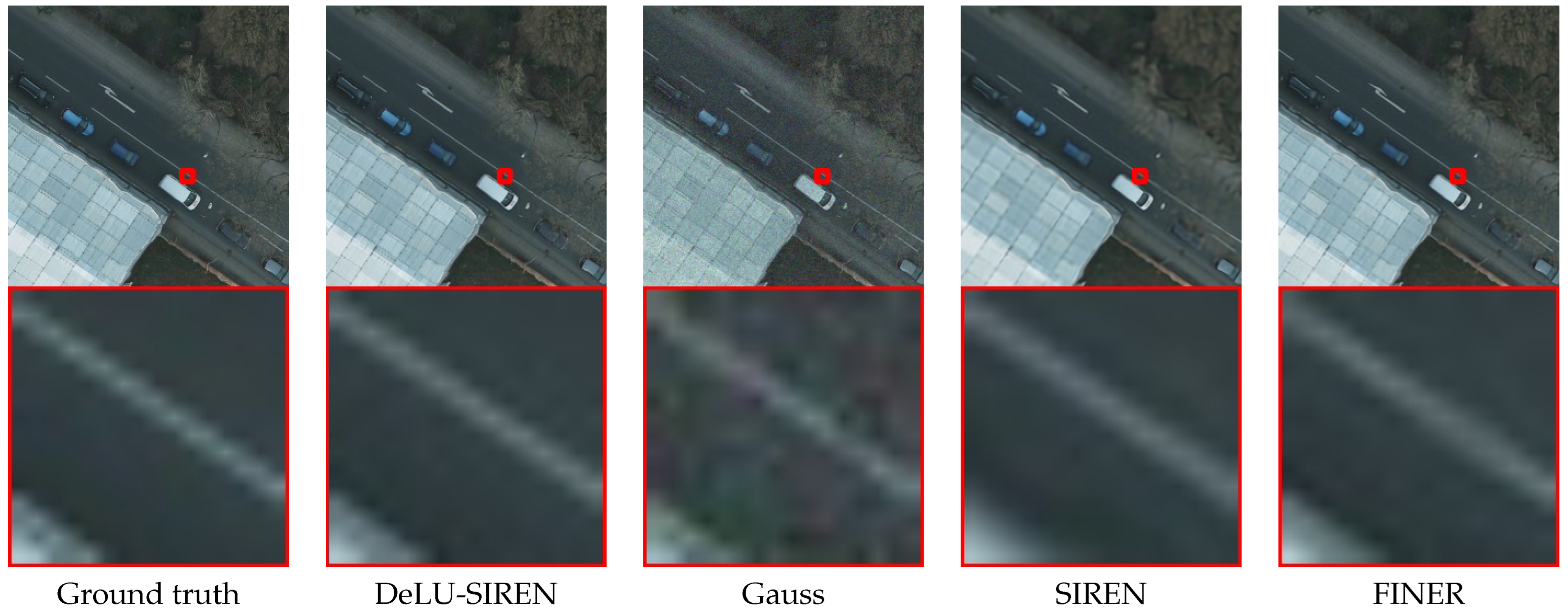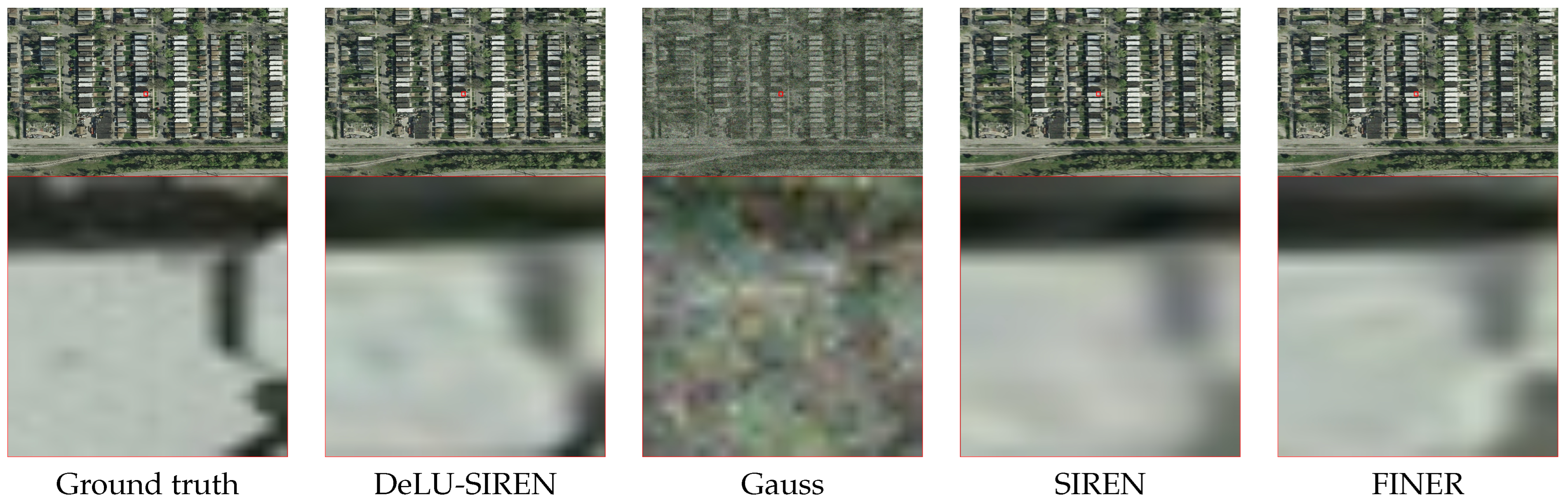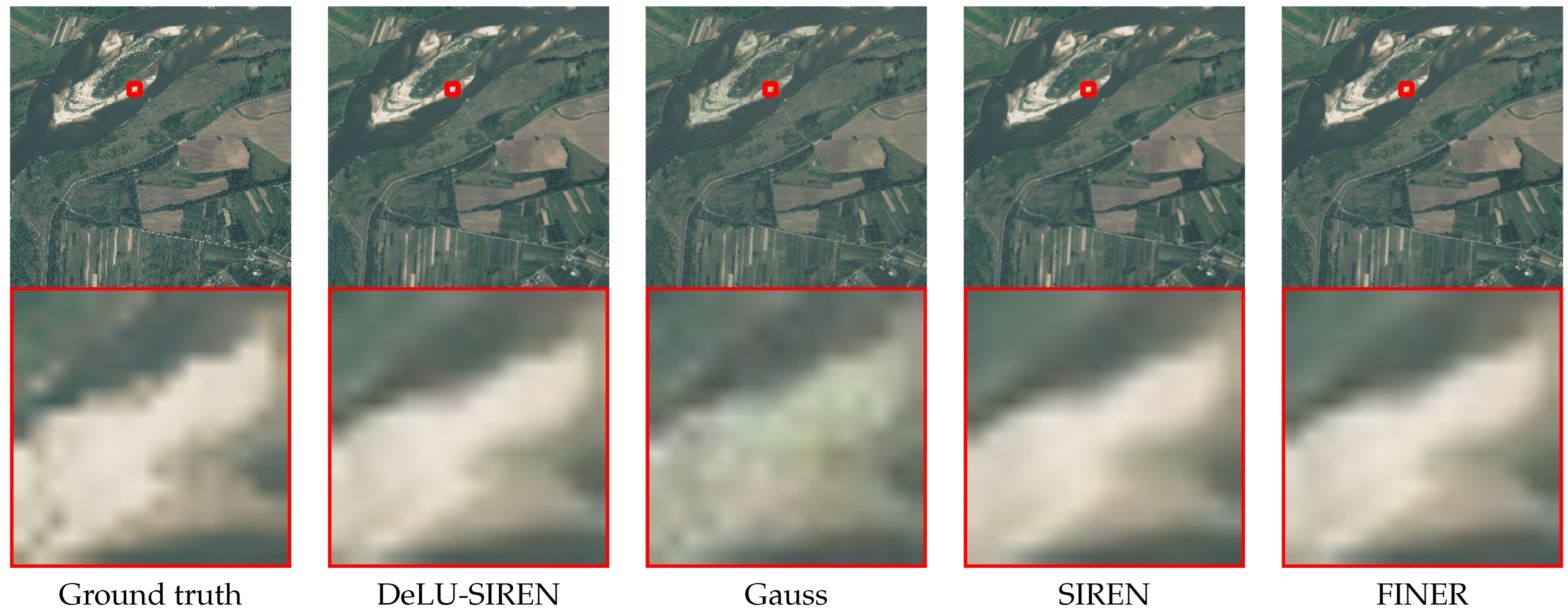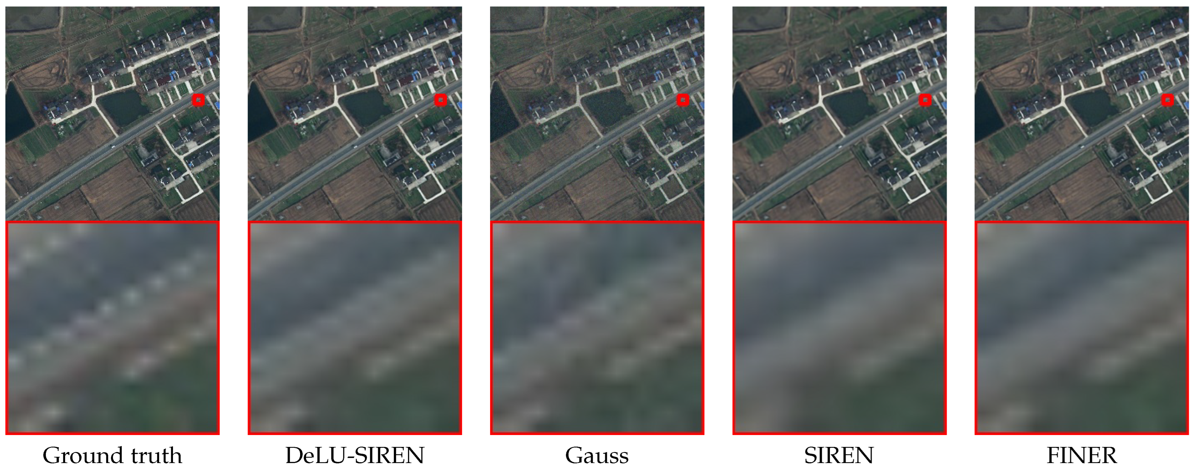 Figure 8. We observe that DeLU-SIREN captures more precise image details than other methods, including Finer, particularly in exposed surface areas of remote sensing images.