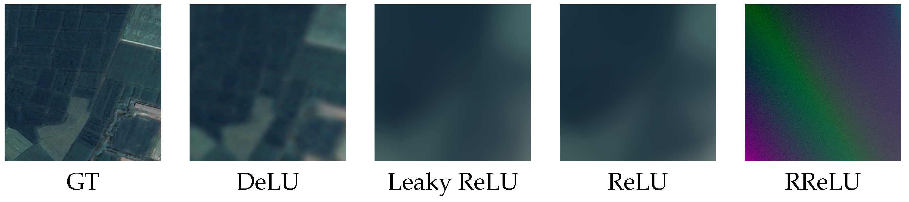 k) regardless of the input value. This stability in gradient flow facilitates efficient learning, particularly for capturing high-frequency components in complex signals. Implicit neural representations require the network to model both low-frequency and high-frequency features of input data. While ReLU’s sparsity in gradients limits its ability to propagate high-frequency information effectively, DeLU maintains robust gradient flow, preserving high-frequency spectral features. Moreover, the constant and symmetric nature of the gradient ensures stable parameter updates, making DeLU particularly advantageous for tasks involving intricate signal representations such as remote sensing images.
