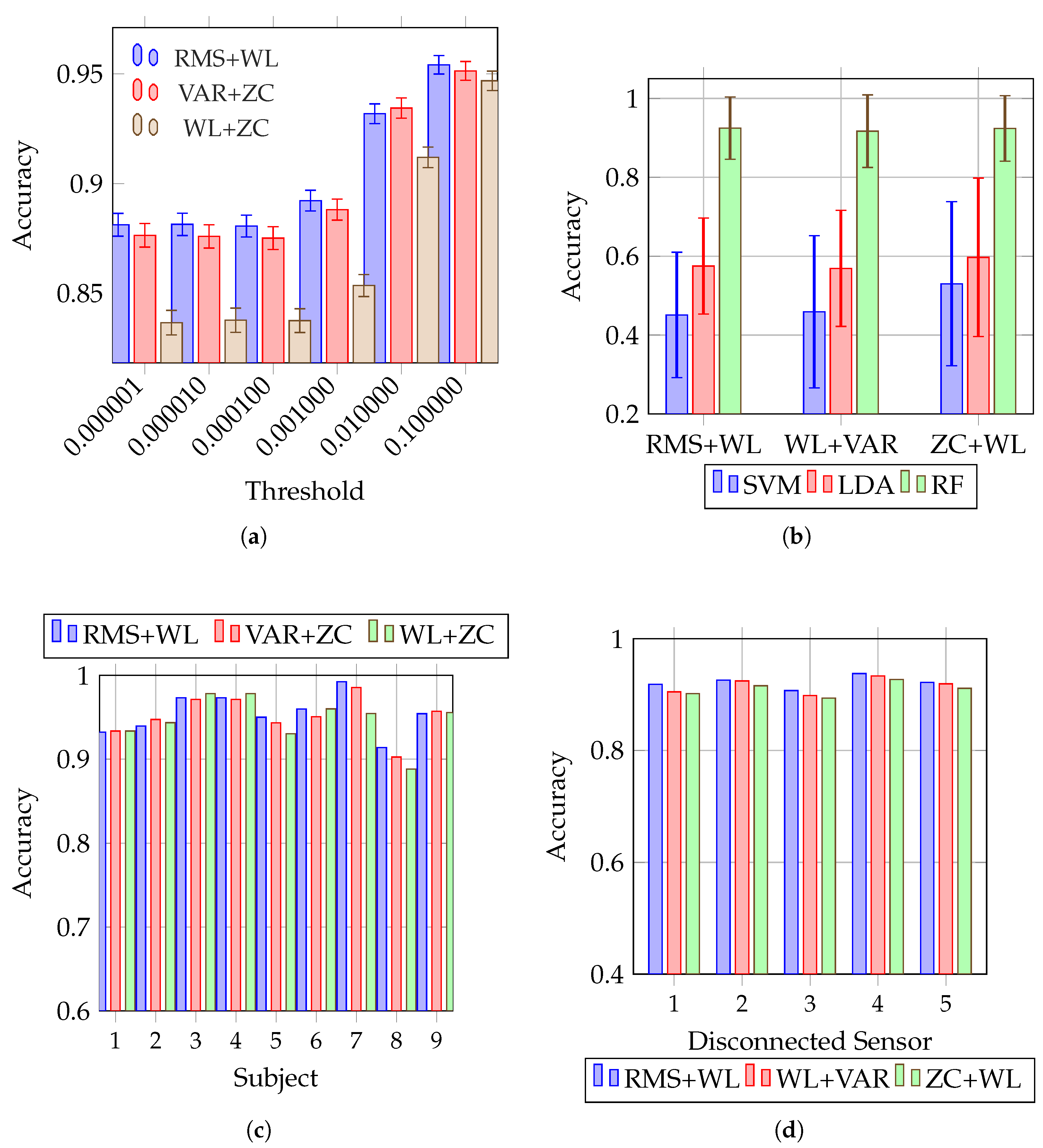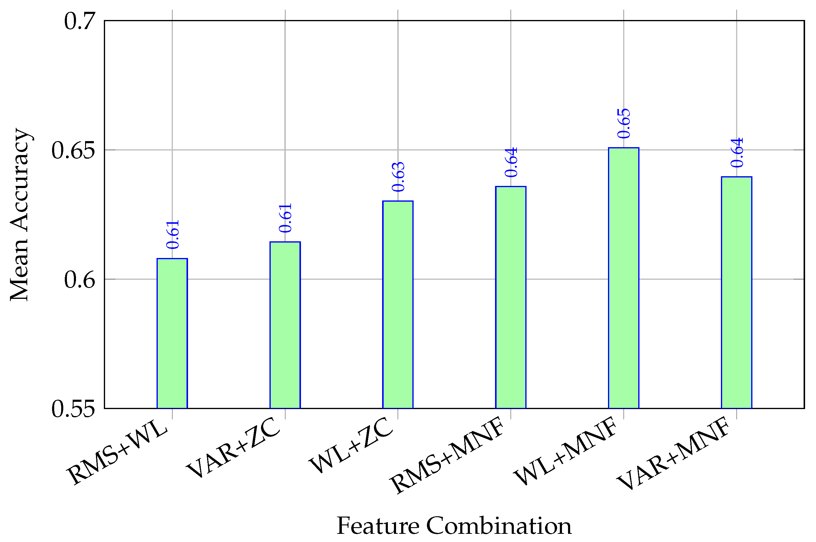 - Hellara, H.; Barioul, R.; Sahnoun, S.; Fakhfakh, A.; Kanoun, O. Comparative Study of sEMG Feature Evaluation Methods and Their Impact on Gesture Recognition Accuracy. Sensors 2024, 24, 3638. [Google Scholar] [CrossRef]