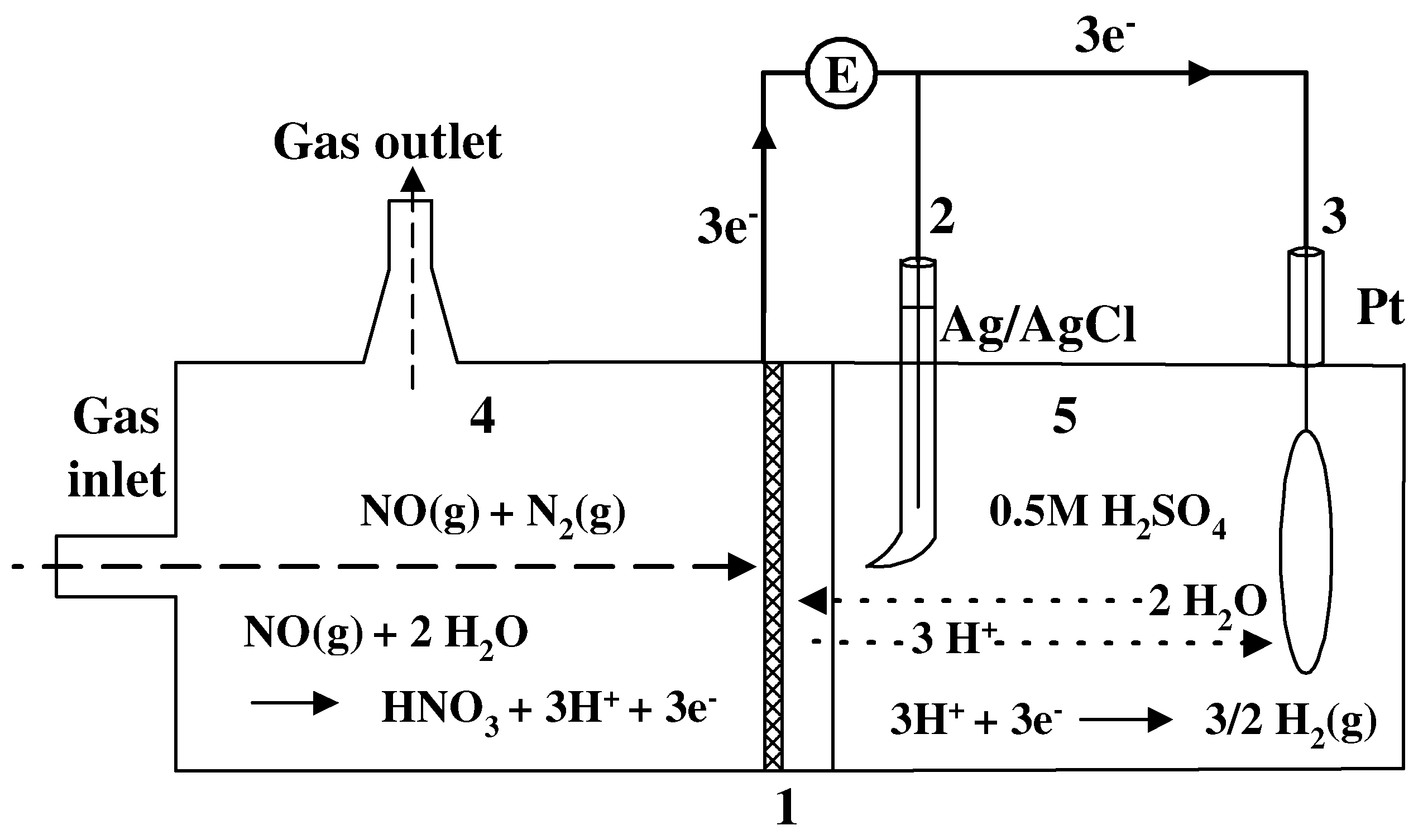 1. WE: Pt/Nafion® 2. RE: Ag/AgCl/sat’d KCl 3. CE: Pt disk 4. Gas chamber: NO(g) in N2(g) or pure N2(g) 5. Liquid chamber: 0.5 M H2SO4