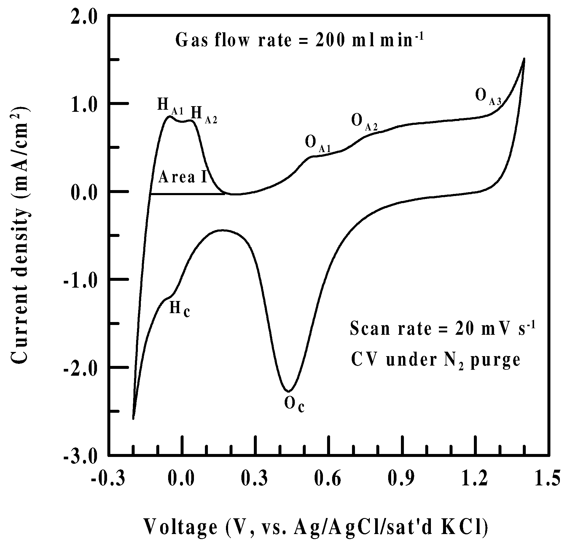 Typical cyclic voltammogram (CV) of the fresh Pt/Nafion® electrode, in contact with 0.5 M H2SO4 solution in N2 atmosphere at a flow rate of 200 ml/min, is shown in Fig. 2. The potential was scanned from -0.2 to 1.4 V at a scan rate of 20 mV/s. The peaks are designated in their order of appearance with increasing anodic potential as “OA1”, “OA2”, and “OA3”, continuing into O2 evolution process. H adsorption and ionization peaks “HA, “HC”, etc. at more cathodic potentials are also indicated together with the cathodic region “OC” for surface oxide reduction.
