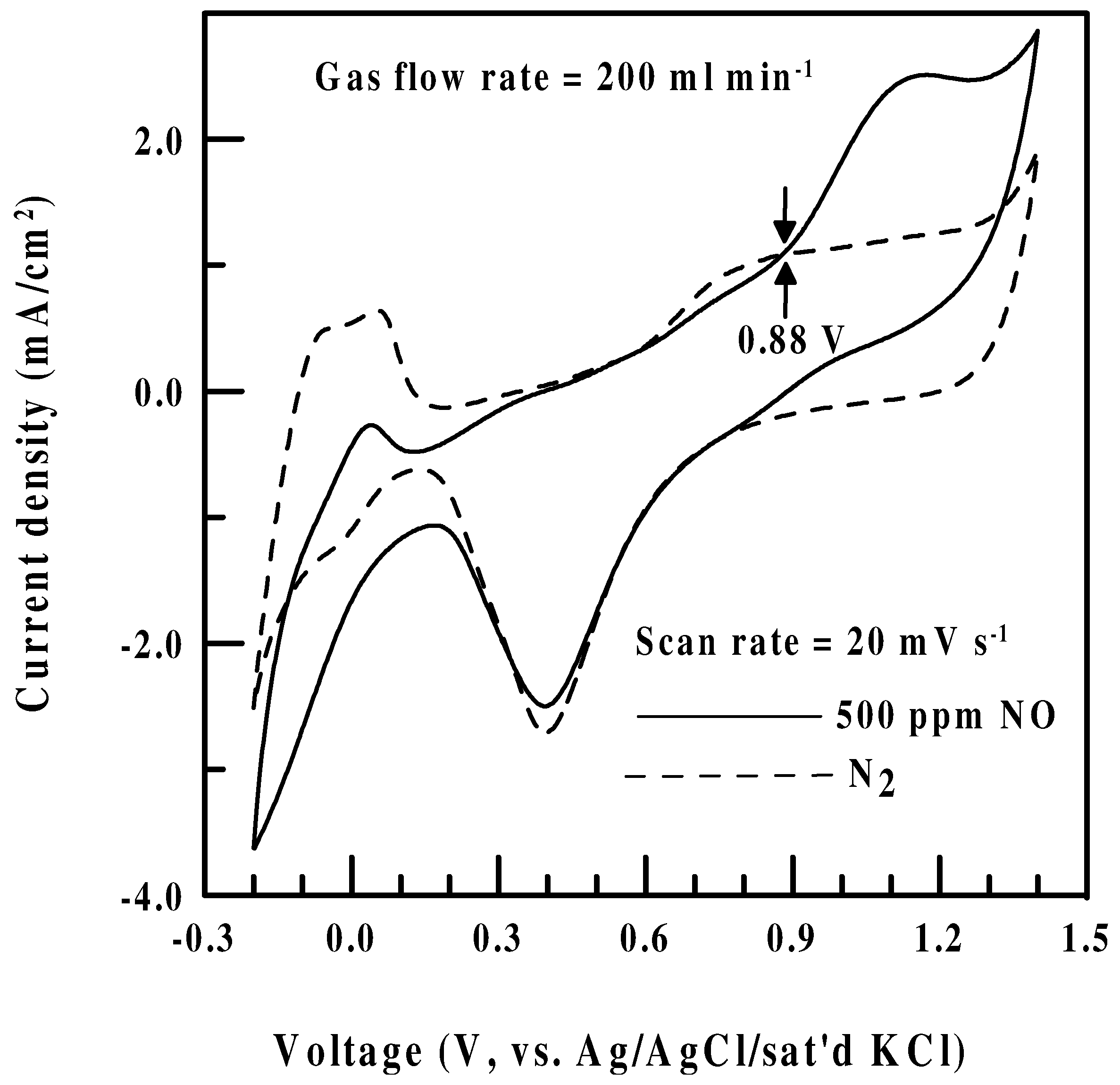 Typical CVs for a Pt/Nafion® electrode run at 20 mV/sec. Gas phase: (—) 500 ppm NO; (− − −) pure N2. Solution phase: 0.5 M H2SO4; The gas flow rate is maintained at 200 ml/min.