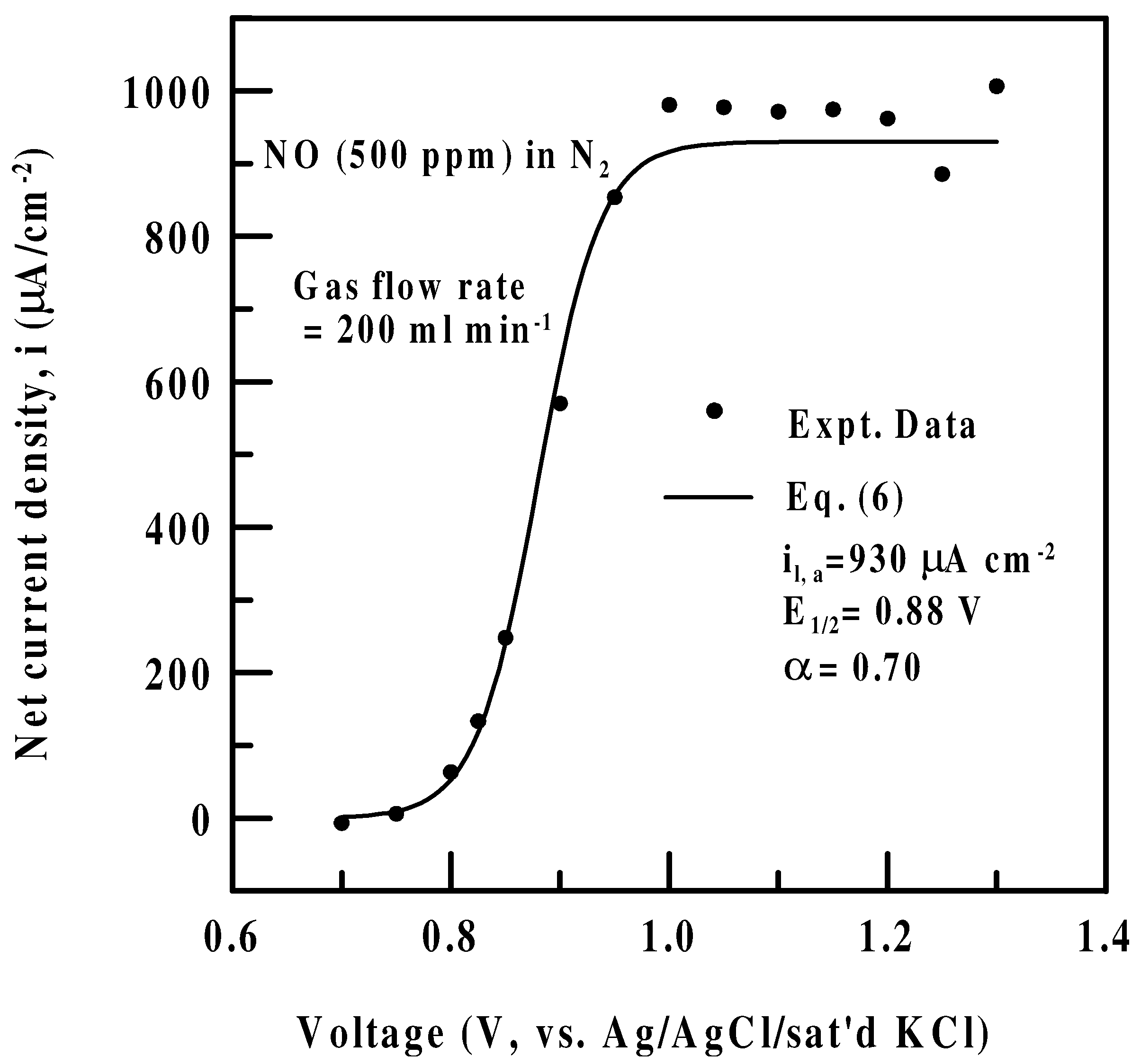 The net current density-potential (i-E) data for oxidizing 500 ppm NO at a Pt/Nafion® electrode. The gas flow rate is maintained at 200 ml/min. The solid curve is obtained by plotting Eq. (6) with appropriate parameters.