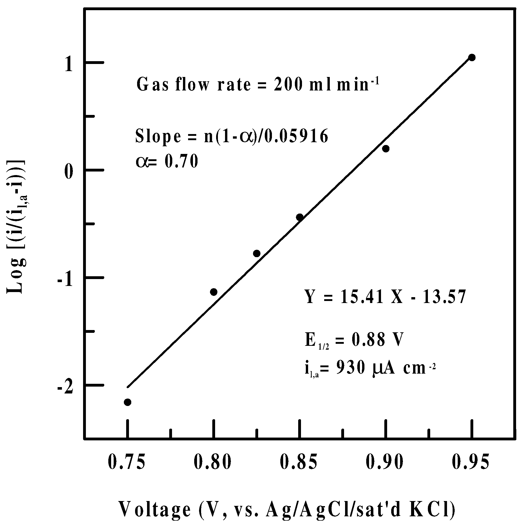 The smooth curve in Figure 4 is obtained by plotting Eq. (6) with il,a=930 μA/cm2 , E1/2=0.88 V, and α=0.70. In fact, when an electrochemical reaction conforms to Eq. (6), a plot of log [i/(il,a-i)] vs. E is a straight line with a slope of (1-α)nF/2.3RT (or n(1-α)/0.05916 V-1 at 25 °C ) and has an E-intercept of E1/2. This is shown in Fig. 5. The obtained value of E1/2 (0.88 V) from the intercept is the same as the onset potential (0.88 V) obtained earlier for NO oxidation under the same experimental conditions, as judged by the CVs in Figure 3.