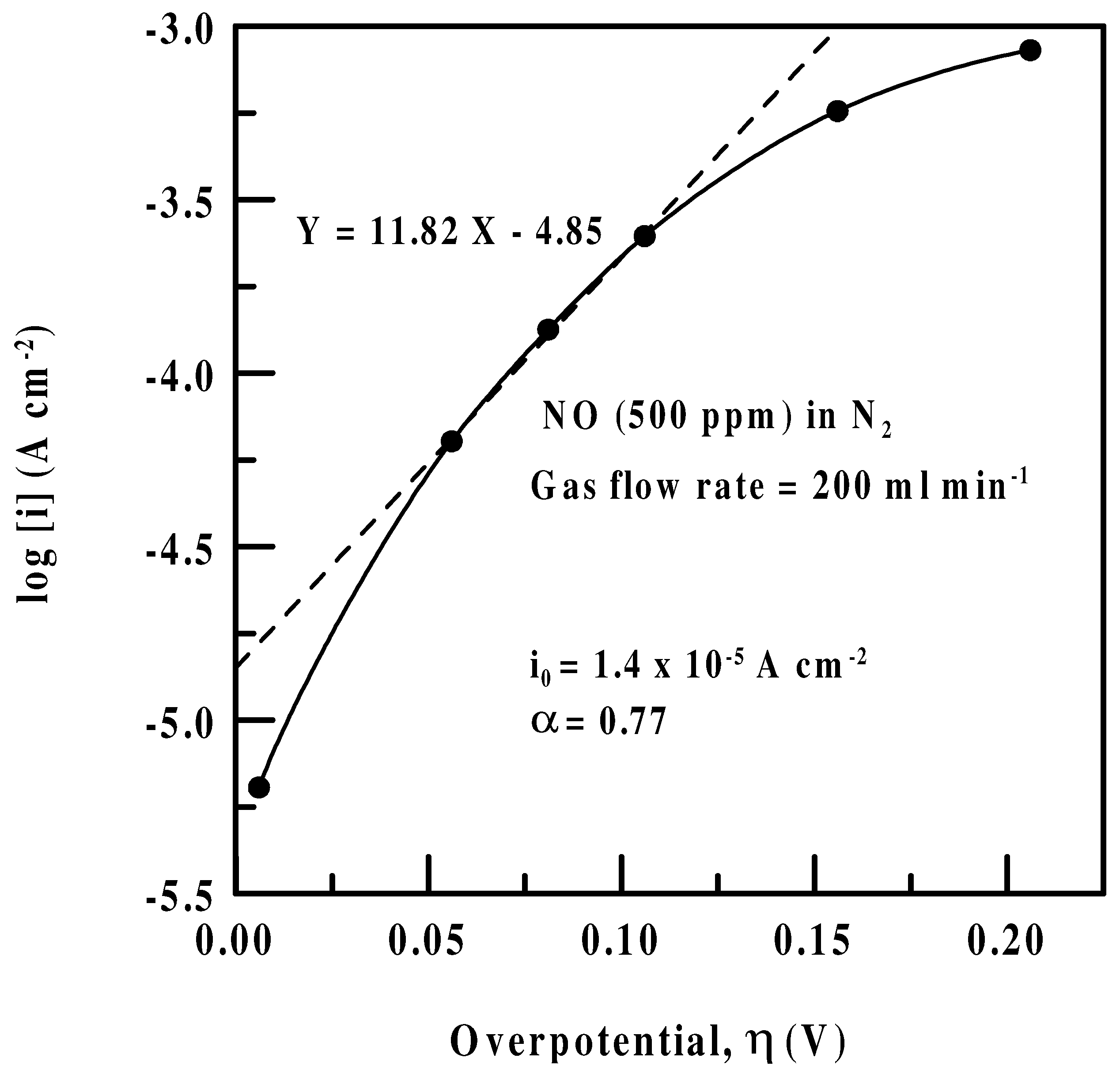 It would be interesting to extract the kinetic parameters for the NO oxidation. This can be done by plotting log [i] vs. η, known as a Tafel plot. For sufficiently large values of overpotential applied (η≡ E-Eeq>118 mV/n=118/3 ≈ 40 mV), the overpotential η can be expressed as [36]
