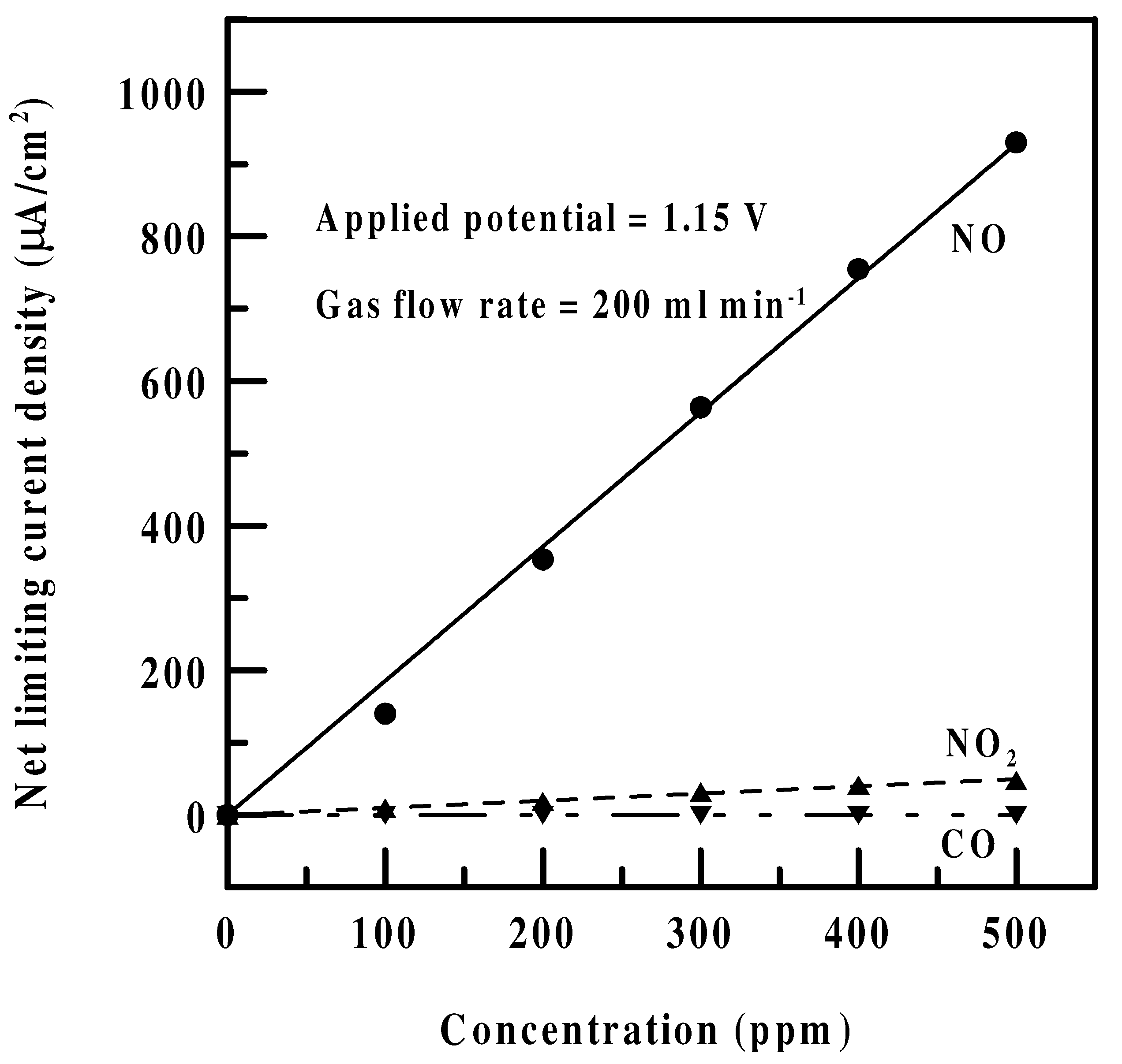 The net limiting current density dependence of NO, NO2, and CO concentrations (0-500 ppm) at the same sensing electrode.