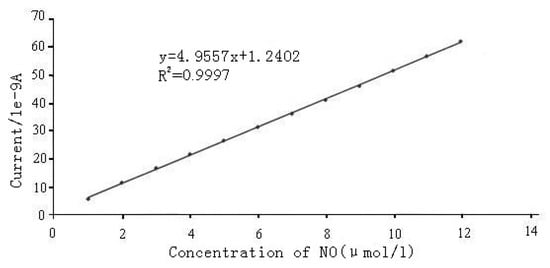 Fig.1 shows a “stair-type” current-time curve of the ISO-NOPMC microsensor to the successive additions of 1.4 μM NO in seawater. The relation between the measured current and the NO concentration is linear for NO concentrations ranging from 1 μM to 10 μM. The result is similar to the literature [19,20], but the value is 10 times that of the literature (Fig. 2).