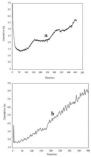 Current-time curve b obtained on increasing the NO concentration in 0.014 μM steps in seawater is shown in Fig.3 (curve b). Not all additions resulted in a peak, and most peaks were irregular. Although quantitative research is impossible with curve b, peak responses exist with NO addition.