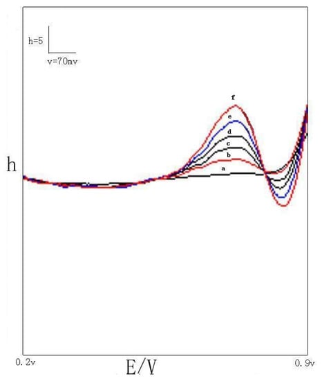 Peak height- voltage curve of the modified platinum microelectrode to the successive additions of NO in seawater. Curve a, without NO; Curve b, [NO]=1.05• mol/l; Curve c:[NO]=2.1• mol/l; Curve d: [NO]=3.15• mol/l; Curve e: [NO]=4.2• mol/l; Curve f: [NO]=5.25• mol/l.