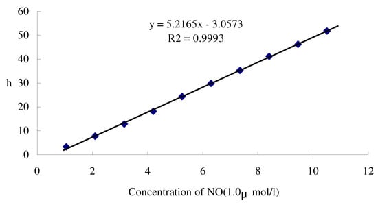 Fig. 4 shows peak height- voltage curves of the modified platinum microelectrode to the successive additions of NO in seawater. Peaks appeared at around 0.8 V, and peak height gradually increased with NO successive additions. The relation between the peak height and the NO concentration was linear for NO concentrations ranging from 1 μM to 10 μM (Fig. 5).