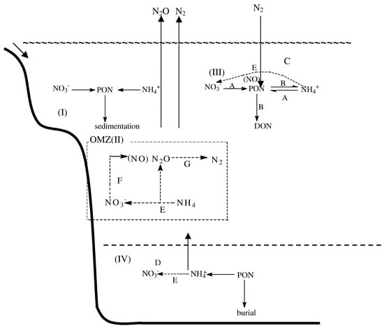 Conceptual diagram of major features of the nitrogen cycle in coastal shelf and upwelling ( I ) ,OMZ (II), surface waters of the open ocean (III), and deepwater(IV). PON, particulate organic nitrogen. Dashed lines indicate transformations involving multiple steps. Pathways: A, DIN assimilation; B, ammonium regeneration; C, nitrogen fixation; D, nitrate diffusion/advection from deep water; E, nitrification; F, nitrification; G, denitrification.