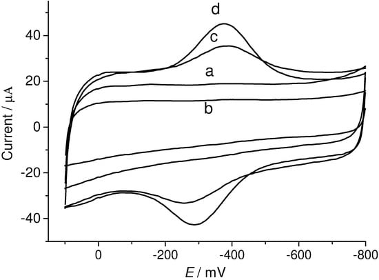 The electrochemical behavior of HRP immobilized on the Au-SPCE was studied using cyclic voltammetry. The HRP-Au-SPCE showed a couple of stable and well-defined redox peaks at –290±3 and –377±3 mV at 50 mV s-1 (curve d in Fig. 1), while no peak was observed at both SPCE (curve a in Fig. 1) and Au-SPCE (curve b in Fig. 1). The presence of gold colloid resulted in a decrease in the background current. Obviously, the response of the HRP-Au-SPCE was attributed to the redox reaction