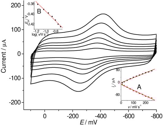 Cyclic voltammograms of HRP-Au-SPCE in 0.1 M pH 7.0 PBS at 25, 50, 75, 100, 150 and 200 mV s-1 (from inner to outer). Insets: plots of peak currents vs. scan rate (A) and plots of anodic peak potential vs. log v (B).
