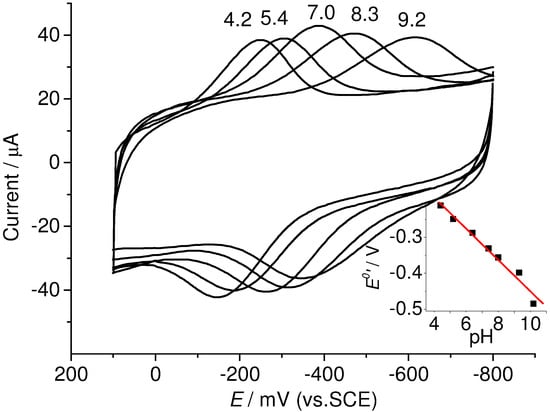 Cyclic voltammograms of HRP-Au-SPCE in PBS with different pHs at 50 mV s-1. Inset: effect of pH on the formal potential