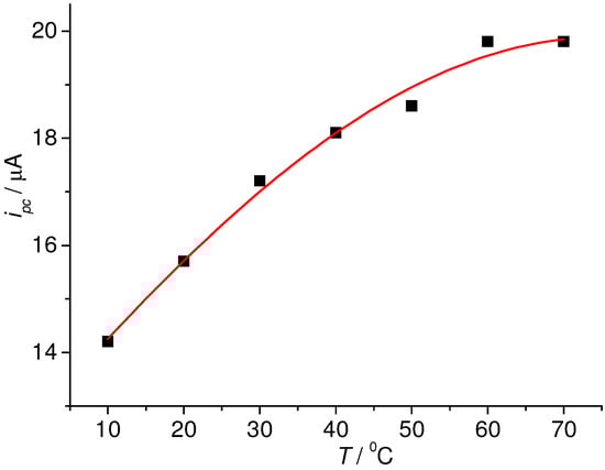 Thermal stability is a measure of the ability of the biosensor to withstand elevations in temperature []. The thermal stability of the biosensor was evaluated by increasing the cell temperature and recording cyclic voltammograms after keeping the corresponding temperature for 20 min. The cathodic peak current of the HRP-Au-SPCE increased with an increasing temperature from 10 0C to 70 oC (Fig. 4), displaying an expected Arrhenius-type temperature dependence. Meanwhile the maximum peak current appeared at 37 oC at HRP-SPCE, and when increasing the cell temperature up to 55 oC no peak was observed, implying denaturation of the immobilized HRP. The improvement of the thermal stability of HRP-Au-SPCE was attributed to the presence of the colloidal gold nanoparticles. The immobilized HRP on colloidal gold nanoparticles enhanced greatly the thermal stability due to the unusual conformational rigidity in this nonpolar binding environment [].